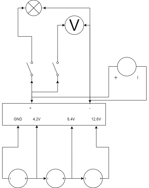 W zasadzie temat akumulatorów mamy załatwiony. Tak jak pisałem moduł ma uniwersalne styki +/- do których podłącza się odbiorniki i ładowanie. W mojej lampie będzie oprócz żarówki jeszcze pomiar stanu akumulatorów. Całość połączona według takiego schematu