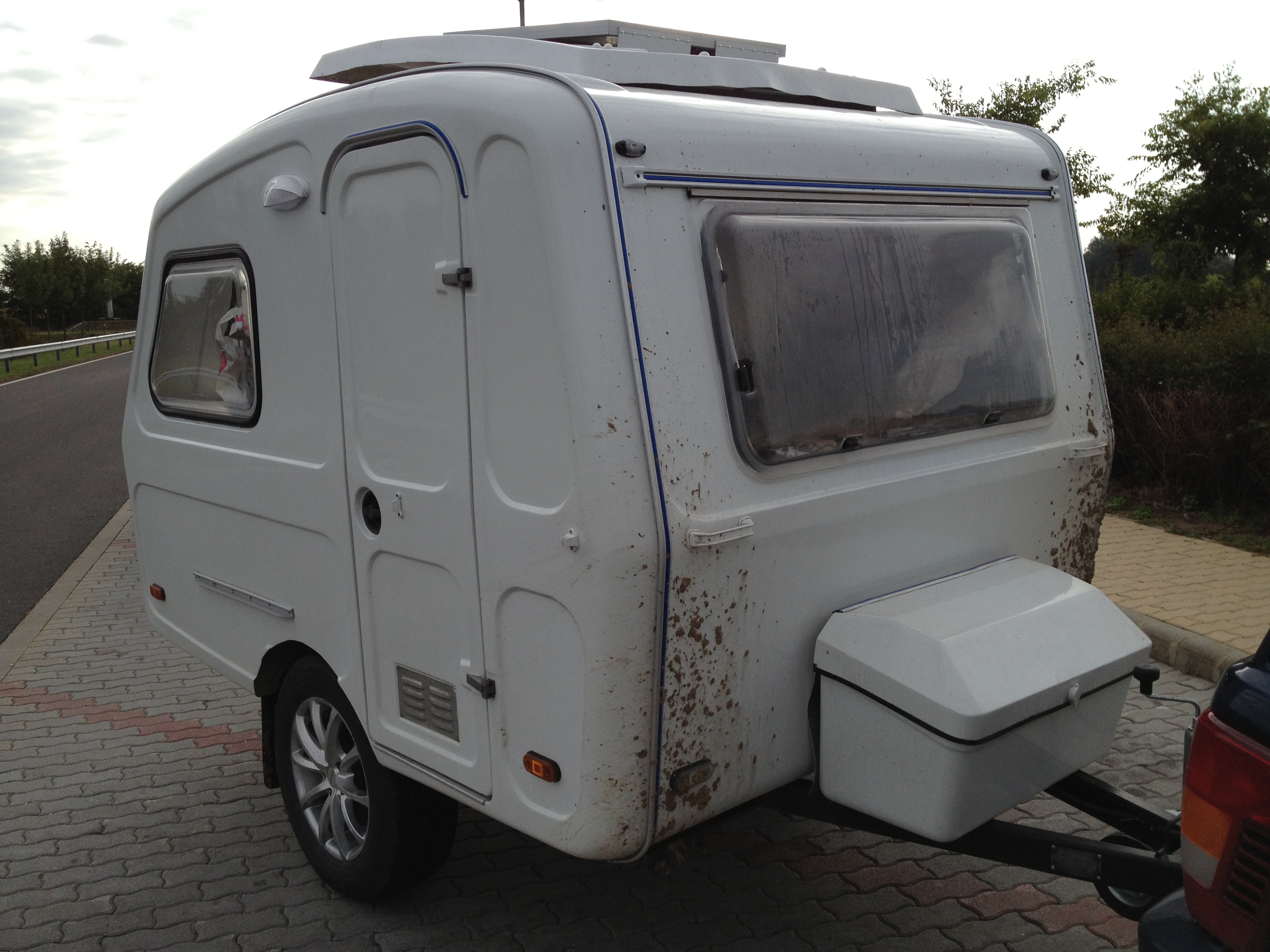 . Przyczepa ma przebudowane wnętrze, z wzdłużnym łóżkiem. Aneks kuchenny standardowo na przodzie z lodówką kompresorową. Na dachu panel słoneczny z akumulatorem. Oś do 1250kg jest uniesiona na kilkucentymetrowych dystansach z profilu zamkniętego celem zmieszczenia kół w nadkolach. Przyczepa jest niezależna energetycznie od auta, jedynie oświetlenie drogowe, które zostało rozbudowane o obrysówki dolne, górne oraz boczne.