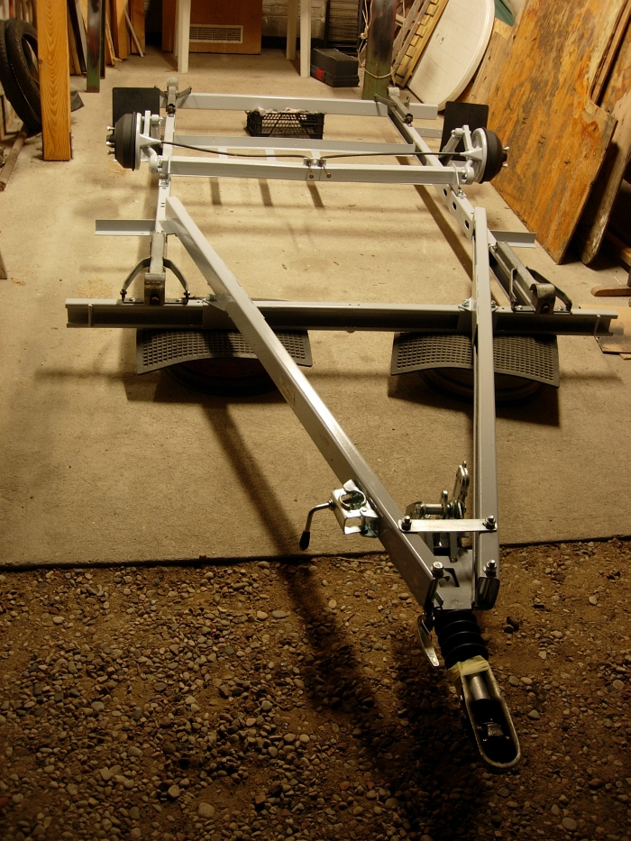Ramę umyłem, odtłuściłem, pokryłem szarym lakierem aby wyglądała świeżo. Belka zawieszenia wypiaskowana, grunt, podkład, lakier. Przegląd łożysk i hamulców. Dorobienie amortyzatorów (obecnie nie polecam bo ta belka i tak jest beznadziejna). Przy okazji zrobiłem podwieszany zbiornik 42L na szarą wodę (polecam!).