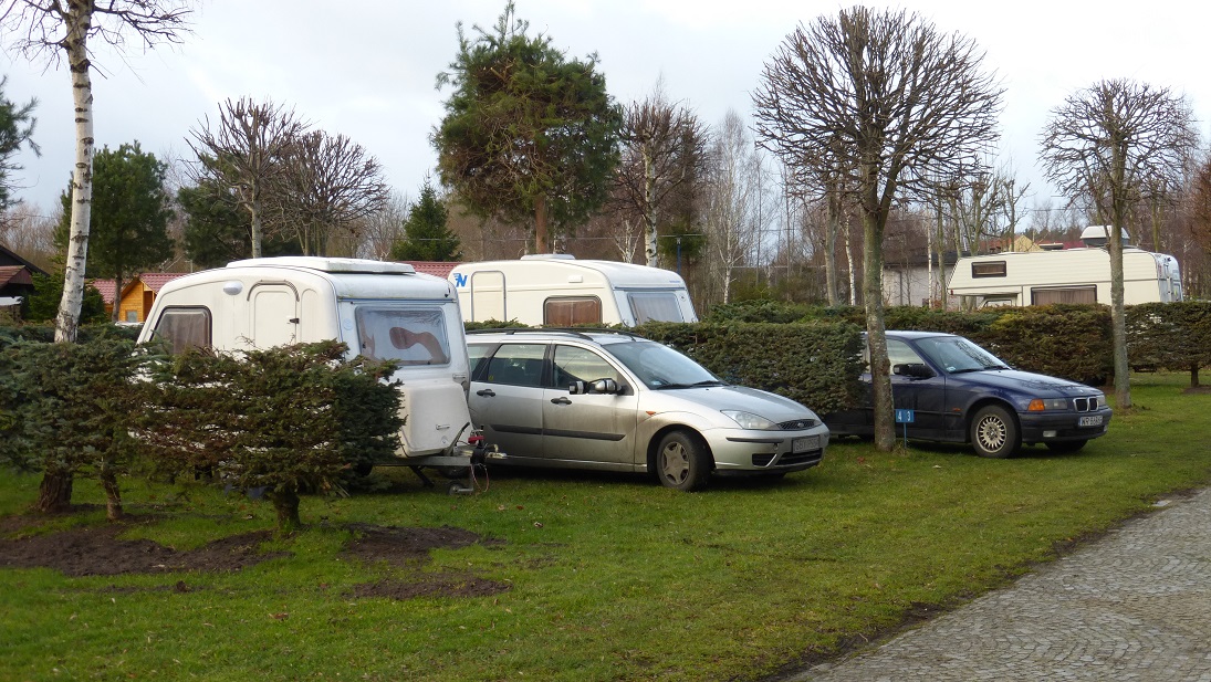 Poza nami jest jeszcze ktoś w domkach a na kempingu stoją puste przyczepy.