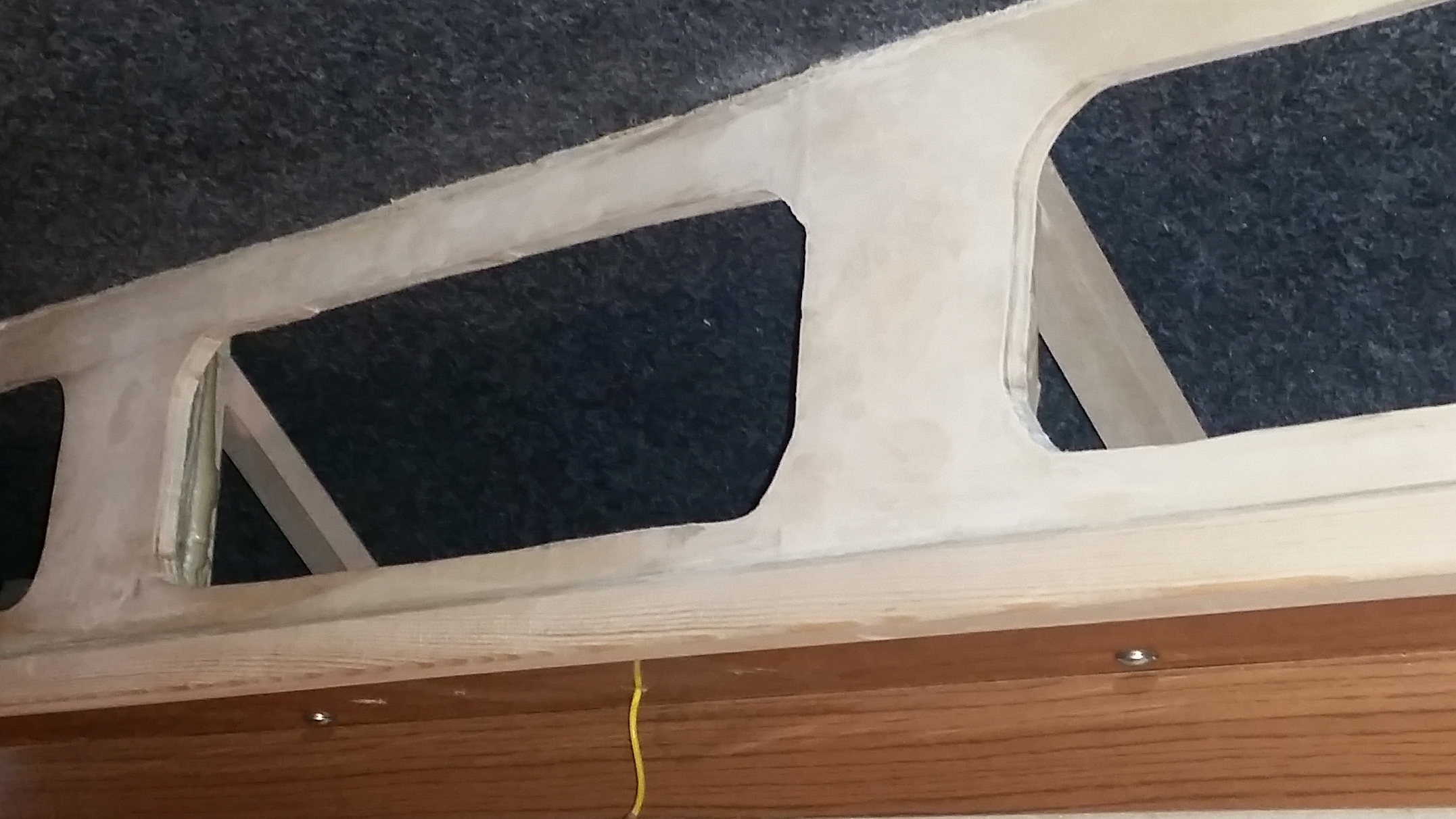 Technicznie to było tak, że zakupiłem w Ikei drewniane wsporniki na pólki 4 szt. po chyba 5 zł. Po drobnej korekcie przykręciłem je do półki, a do nich płytę czołową ze sklejki. Całość skręciłem i skleiłem dodatkowo siką. Otwory z wkrętami zaszpachlowałem. Ze względu na małą ilość szafek zamykanych w naszych cepkach, pólka taka (przynajmniej z przodu) wydaje mi się niezbędna na różne drobiazgi np. kuchenne. Z tyłu zostawiłem półkę otwartą,