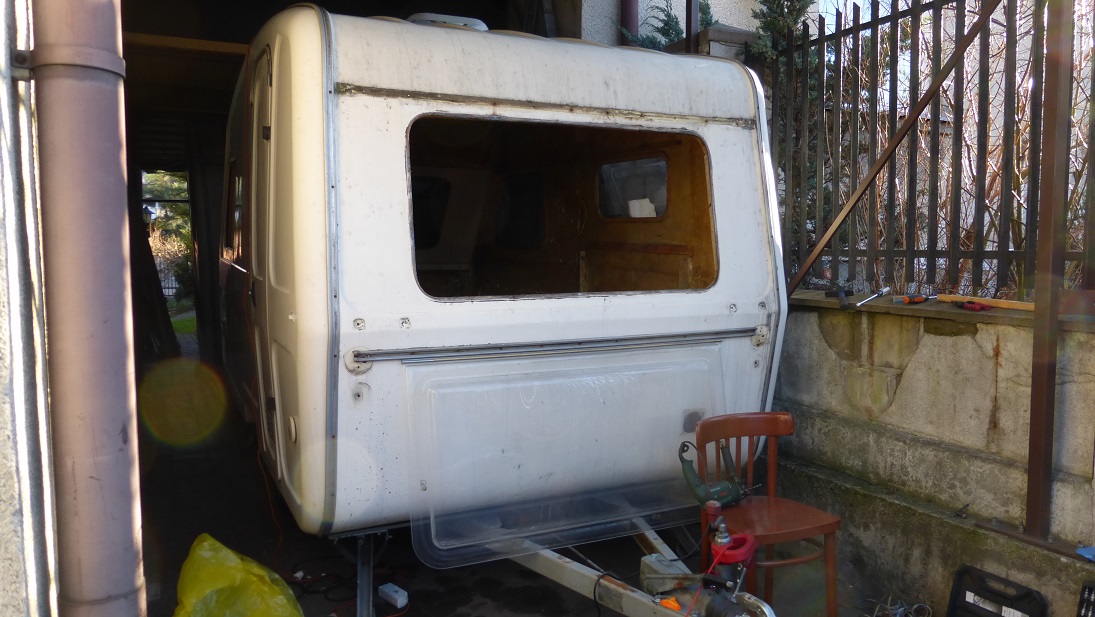 Początkowo źle się zrozumieliśmy i myśleli, że będą mi tą przyczepę oklejali więc "majster od tapicerki" stwierdził, że przyczepę trzeba wstawić do jego garażu. Oczywiście nie chciała się zmieścić, już mieliśmy zdejmować koła żeby wjechać na bębnach, kiedy mu się odwidziało i stwierdził, że skoro nie będą oklejać to do samego zrobienia szablonów może stać na podwórzu.
