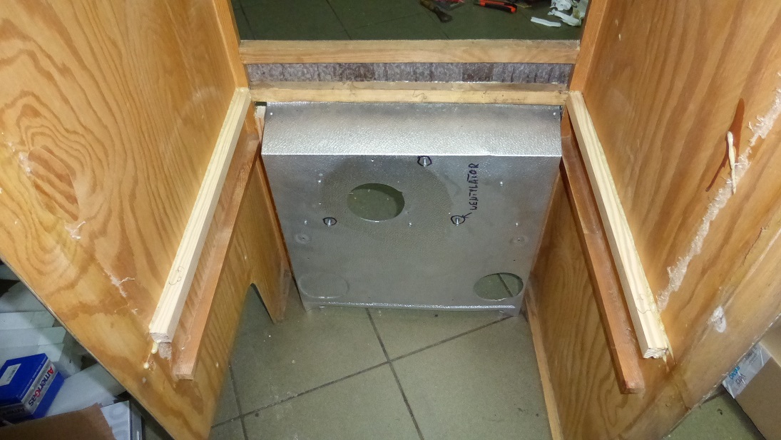 Zarówno szafa jak i widoczna na fotce tylna górna półka będą miały podświetlenie wnętrza ale jeszcze tego nie zrobiłem. Z półką był problem bo była strasznie krzywa a drzwiczki tragicznie odstawały. Żeby ją wyprostować i nadać jako taki kształt, wkleiłem od środka kantówki, tuż nad górną krawędzią otworów i przez całą szerokość półki. Dzięki temu sklejka się wyprostowała i drzwi zaopatrzone w nowe zamki i podnośniki zamykają się jak trzeba.