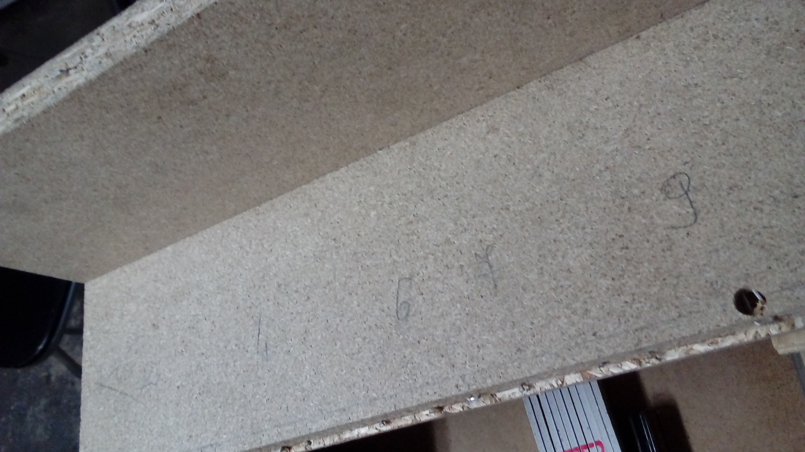 Połączenia na kołki wychodzą idealne. Tu wykonałem połączenie wiórowej płyty na pięciu kołkach ( dyblach ) widać ołówkiem numeracje wdg listwy