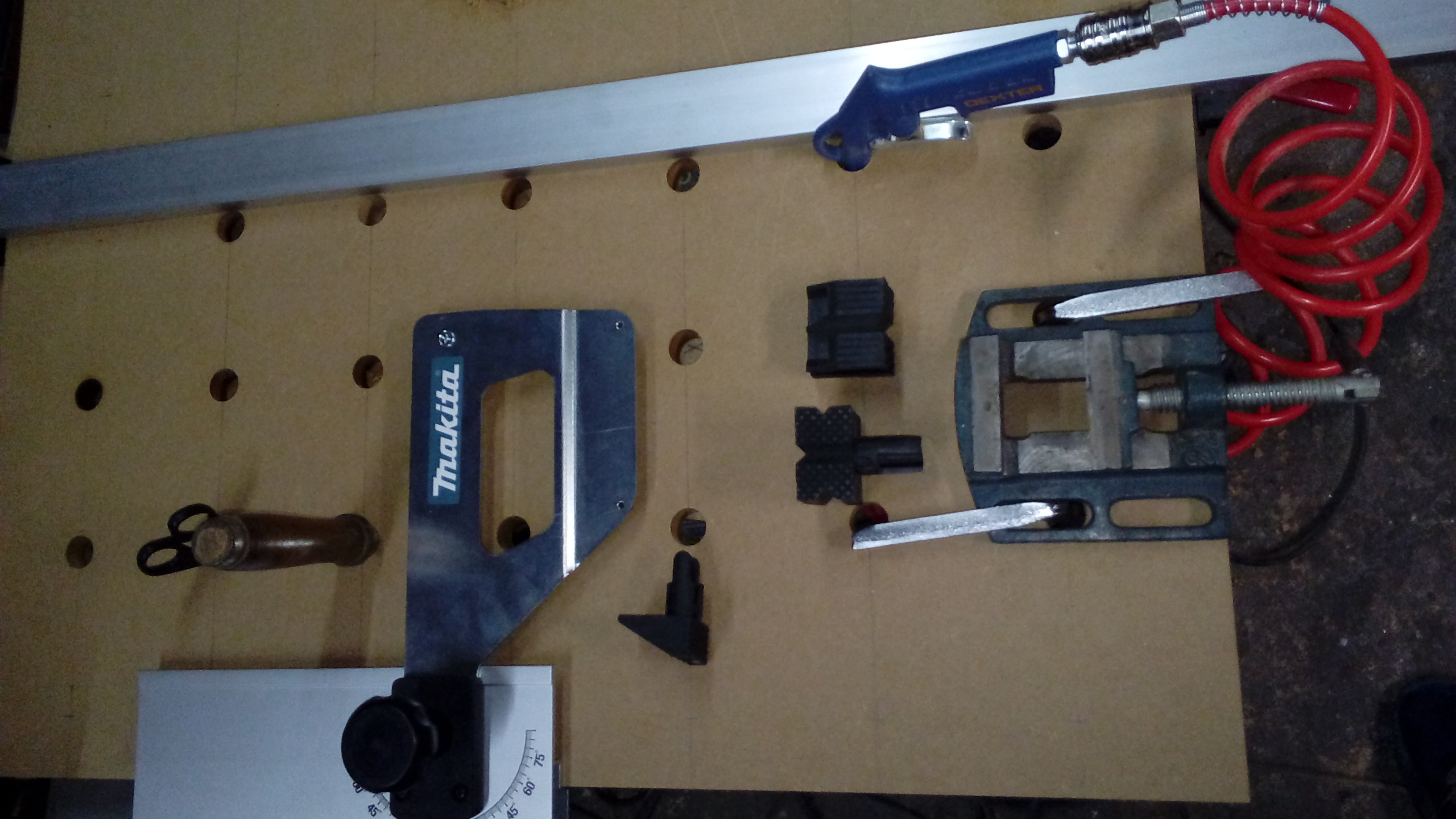 Specjalne piny z tworzywa, które mają właśnie średnicę 20 mm i są uniwersalne, różnej wielkości jak widać na zdjęciach, można nimi unieruchomić obrabiane elementy. Do tego proste boki blatu, docięte do kątów prostych posłużą jako prowadnik kątomierza. Wiercić można przez stół, wykorzystując do tego właśnie otwory w blacie. Na dodatek przechowywać takie rzeczy jak śrubokręty, nożyczki itp bez obawy o przypadkowe strącenie z blatu przy wykonywaniu prac. Mało tego, pod blatem możemy zamontować przedłużacz i nie martwić się gdzie podpiąć elektronarzędzie. Zamocować stałe oświetlenie itp oraz wkleić na stałe miarę stalową ( mam kilka kupionych, długości 3 metrów i podziałka od lewa do prawa, specjalna sama taśma do wklejenia w blat maszyn czy stołów )