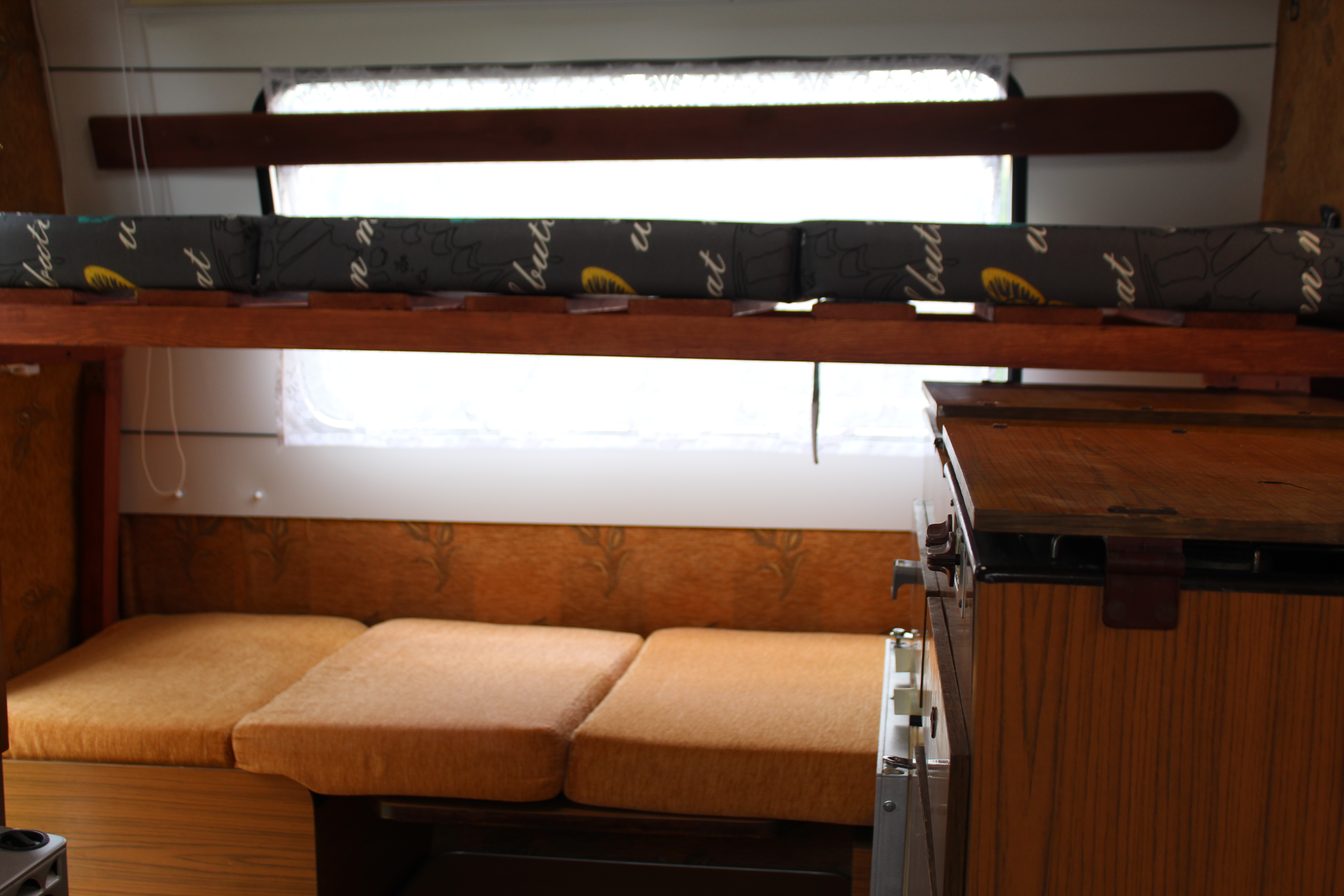 komora w dolnym łóżku z płyty wirowej 18 mm. wysokość dolnego łóżka około 25 cm. (przyczepa stoi poza miejscem zamieszkania to i problem z wymiarami)