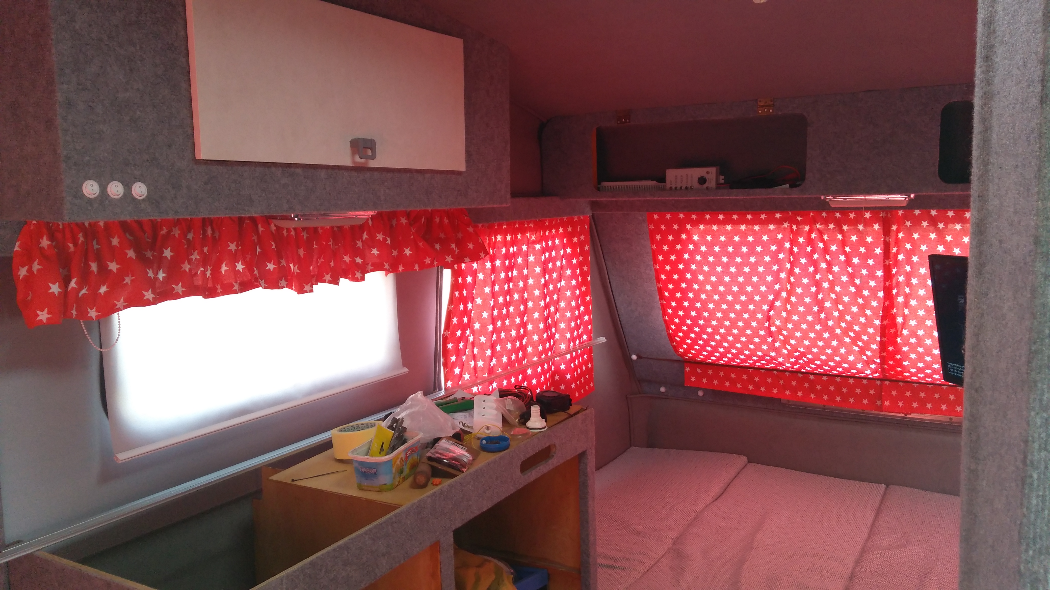 , specjalny bezpiecznik 50A na akumulatorze jako ostateczne zabezpieczenie zwarciowe do tego gniazdo 220v do podłączenia prostownika. Zamontowałem prawie wszystkie fronty razem z zamkami, zostało mi przytnąć drzwi od szafy o kilka centymetrów i z frontami będzie koniec. Lodówka hmm miałem piękna lodówkę, ale tylko na 220v a potrzebuje na gaz, udało mi się nabyć taką lodówkę ale w gorszym stanie przełożyłem urządzenie i teraz mam piękna lodówkę na 229v i gaz.