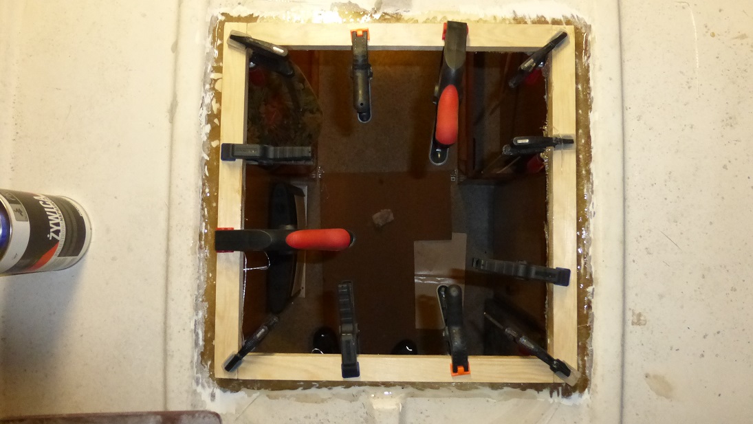 Wysmarowałem laminat i ramkę żywicą po czym skleiłem ze sobą łapiąc ściskami. Pomiędzy laminat a drewno ułożyłem jeszcze paski tkaniny szklanej.