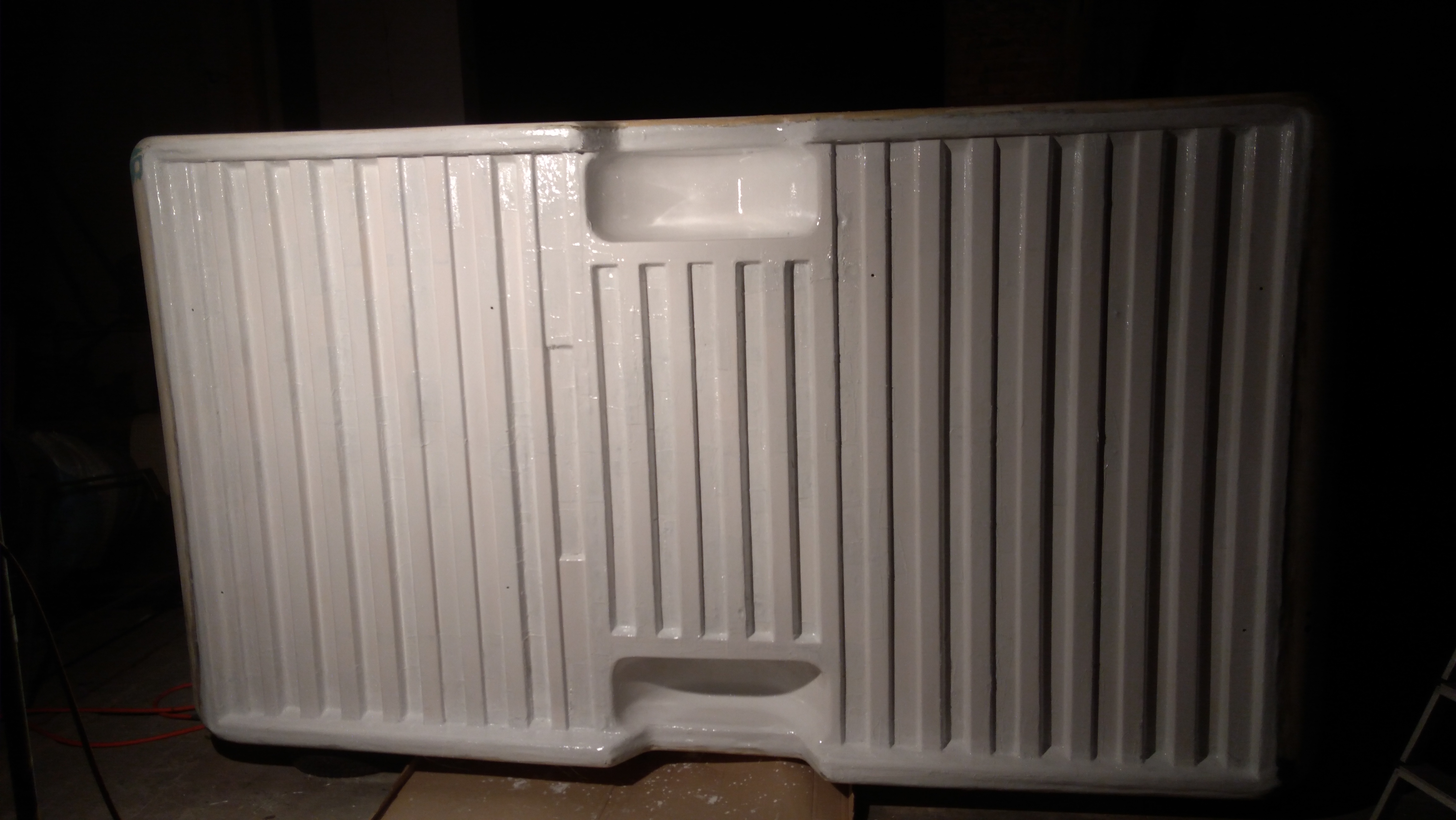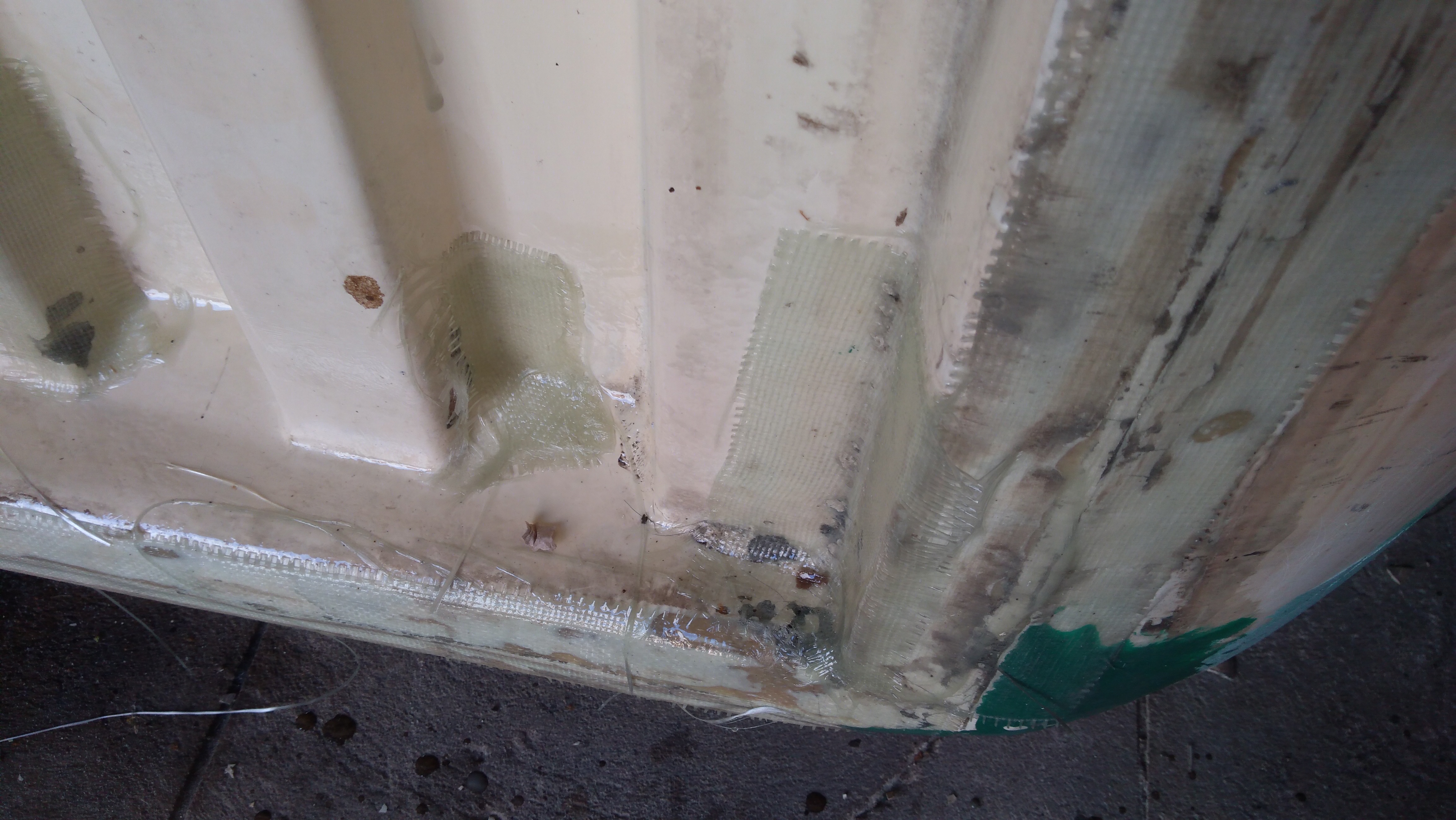 W związku z powyższym w ręce rowing, żywica, pedzel, nożyczki i ogień. Przykleiłem chyba ze 150 łatek! Czemu łatki a nie całość? A no temu, że rowing, który mam waży 450g/m2. Każdy metr to prawie 0,5 kg. Niby nic ale ziarnko do ziarnka...