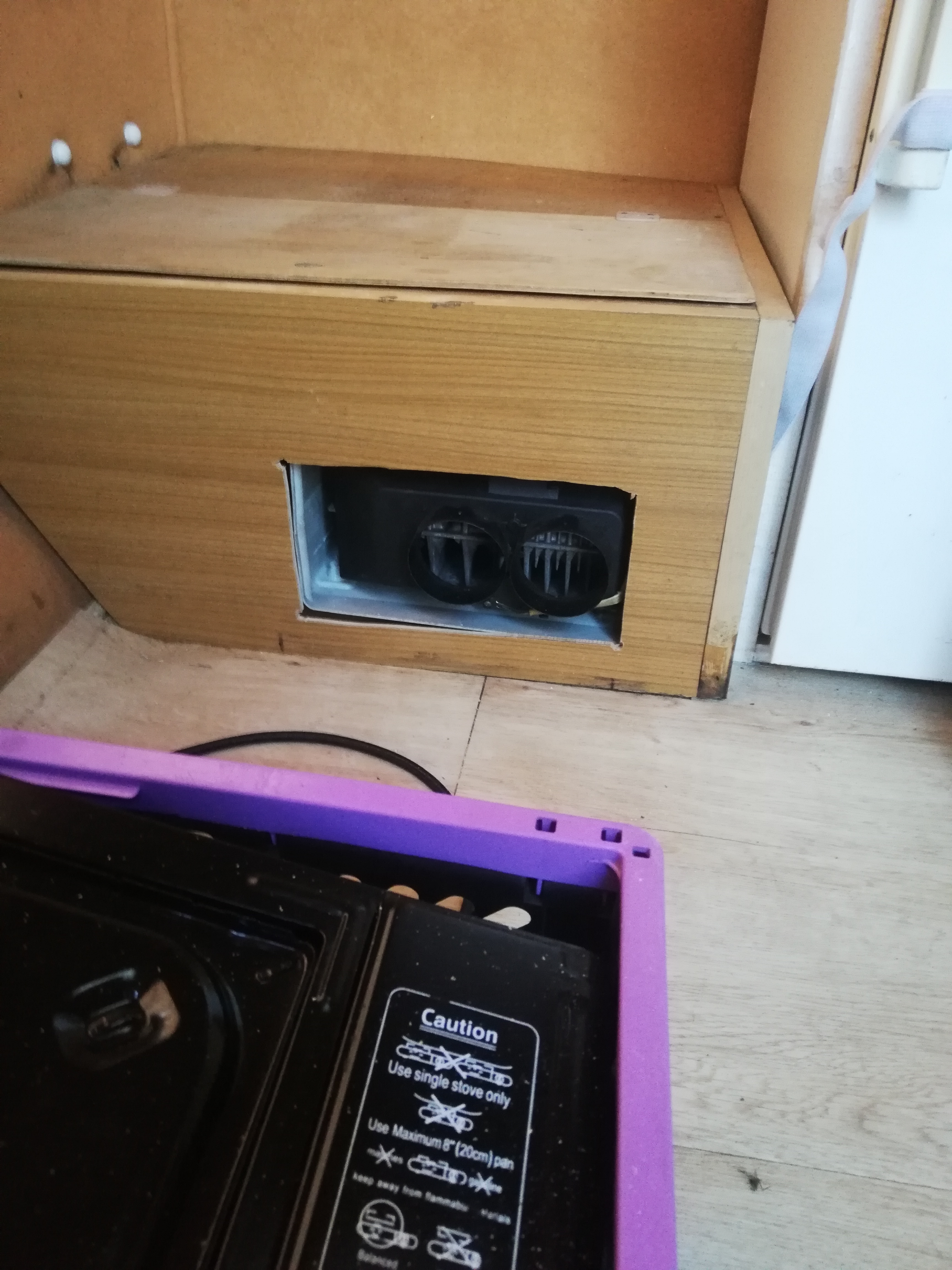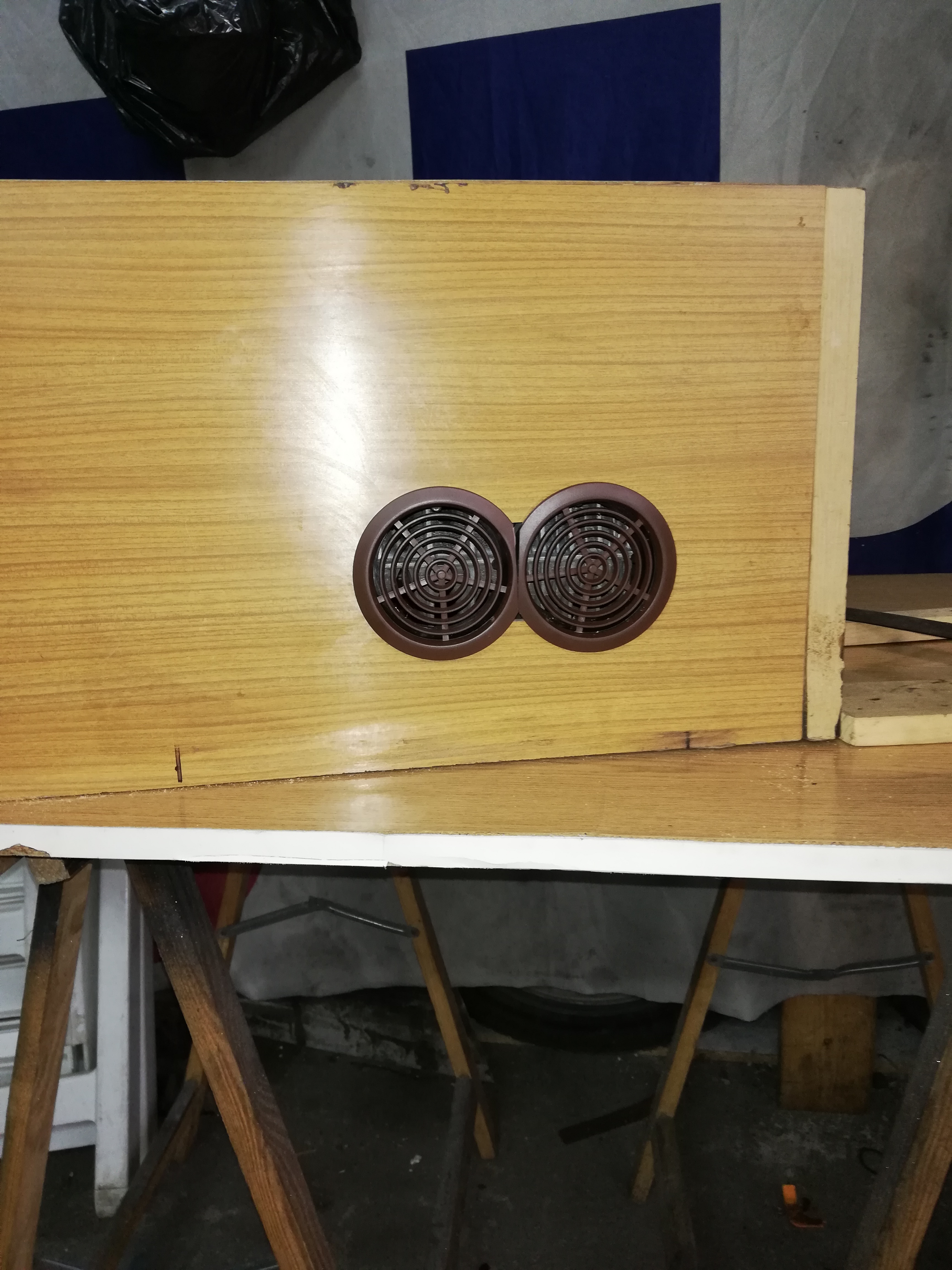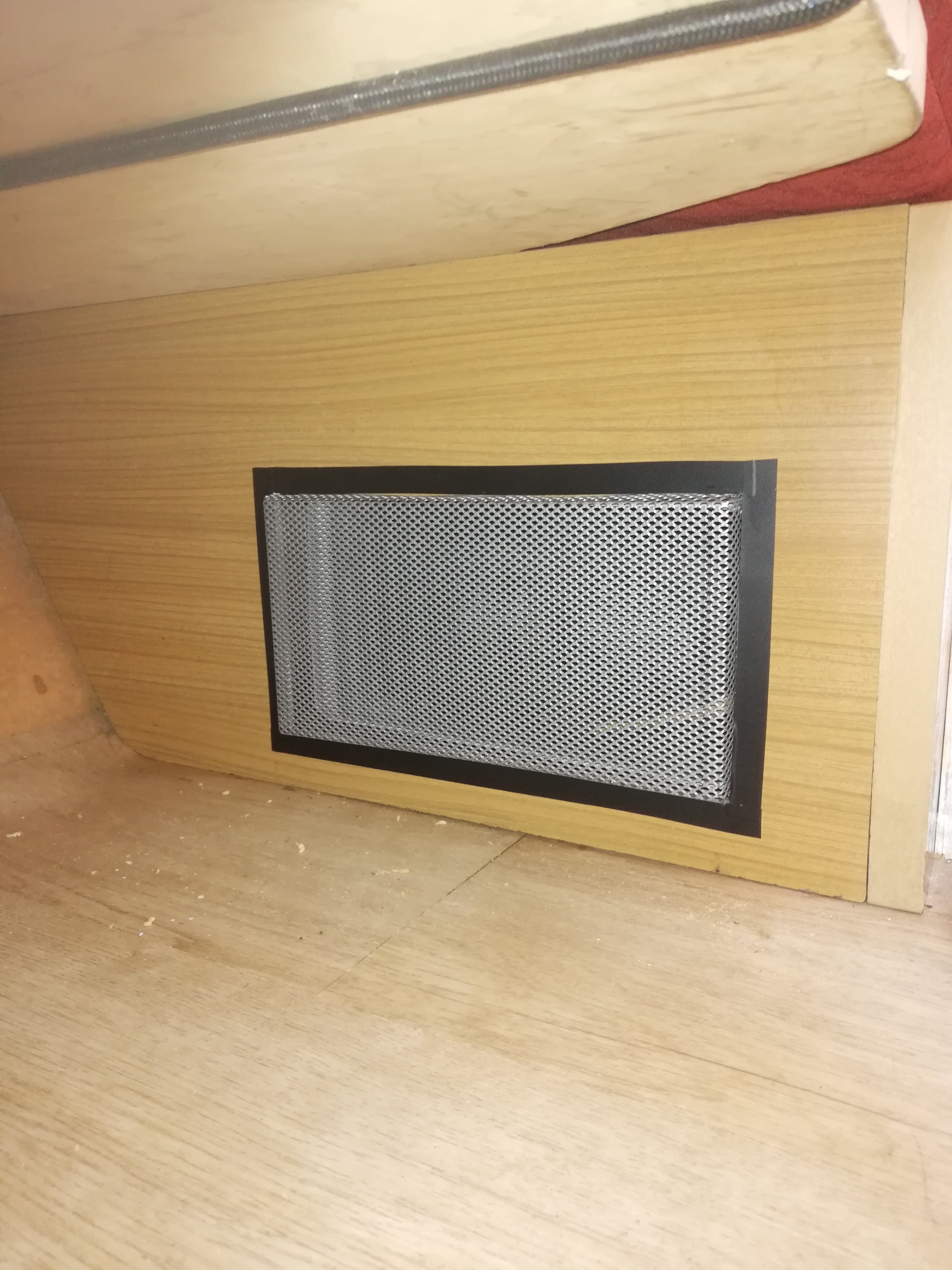 Niestety plastikowe kratki się pomarszczyły i samoróbka zastąpiła je. Dla przypomnienia. Wylot ogrzewania gazowego z nadmuchem.