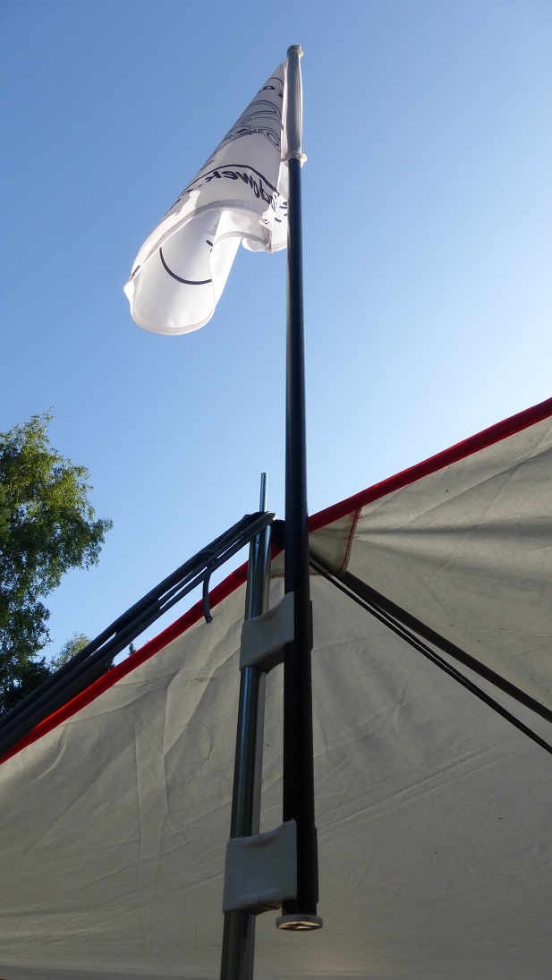Pokazałbym wcześniej ale gdzieś zapodziałem fotki, chociaż teraz po kilku spotkaniach wielu wie o co chodzi :) Na bazie rurki od karnisza która idealnie zastępuje oryginalne nóżki od stolików a przy okazji ma identyczną średnicę jak segmenty nóg daszku z Decathlonu, wymodziłem sobie maszcik na fanklubową flagę.