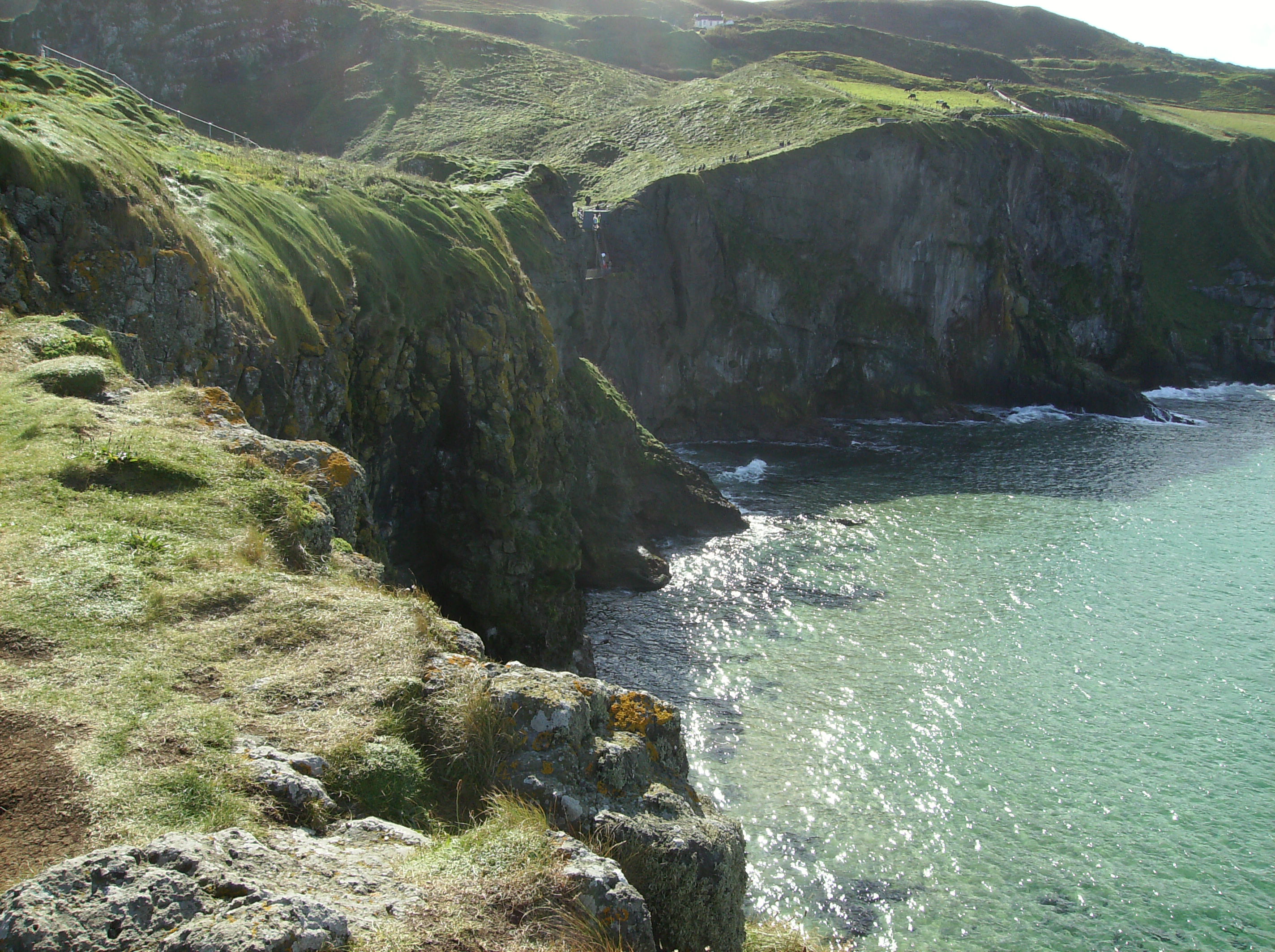 Carrick-a-Rede Rope Bridge. Most linowy łączy kontynent z niewielką wyspą Carrickarede. Ma 20 metrów długości i jest zawieszony 30 metrów na taflą wody. Przejście jest płatne a w zeszłym roku pokonało go prawie pół miliona turystów. Zdarzały się przypadki że turyści nie mogli pokonać lęku przed ponownym wejściem na most i musieli być zabrani z wyspy łodzią.