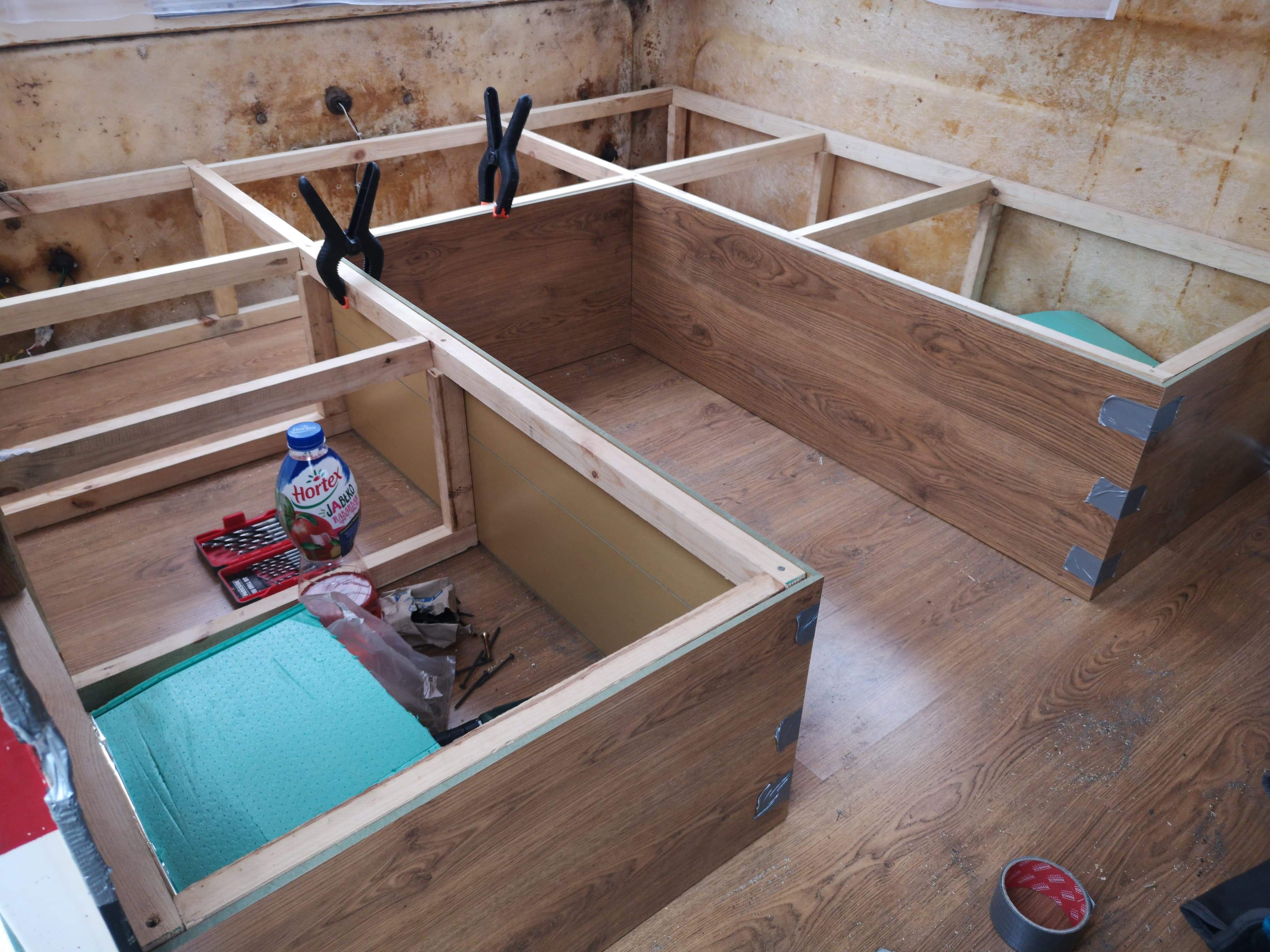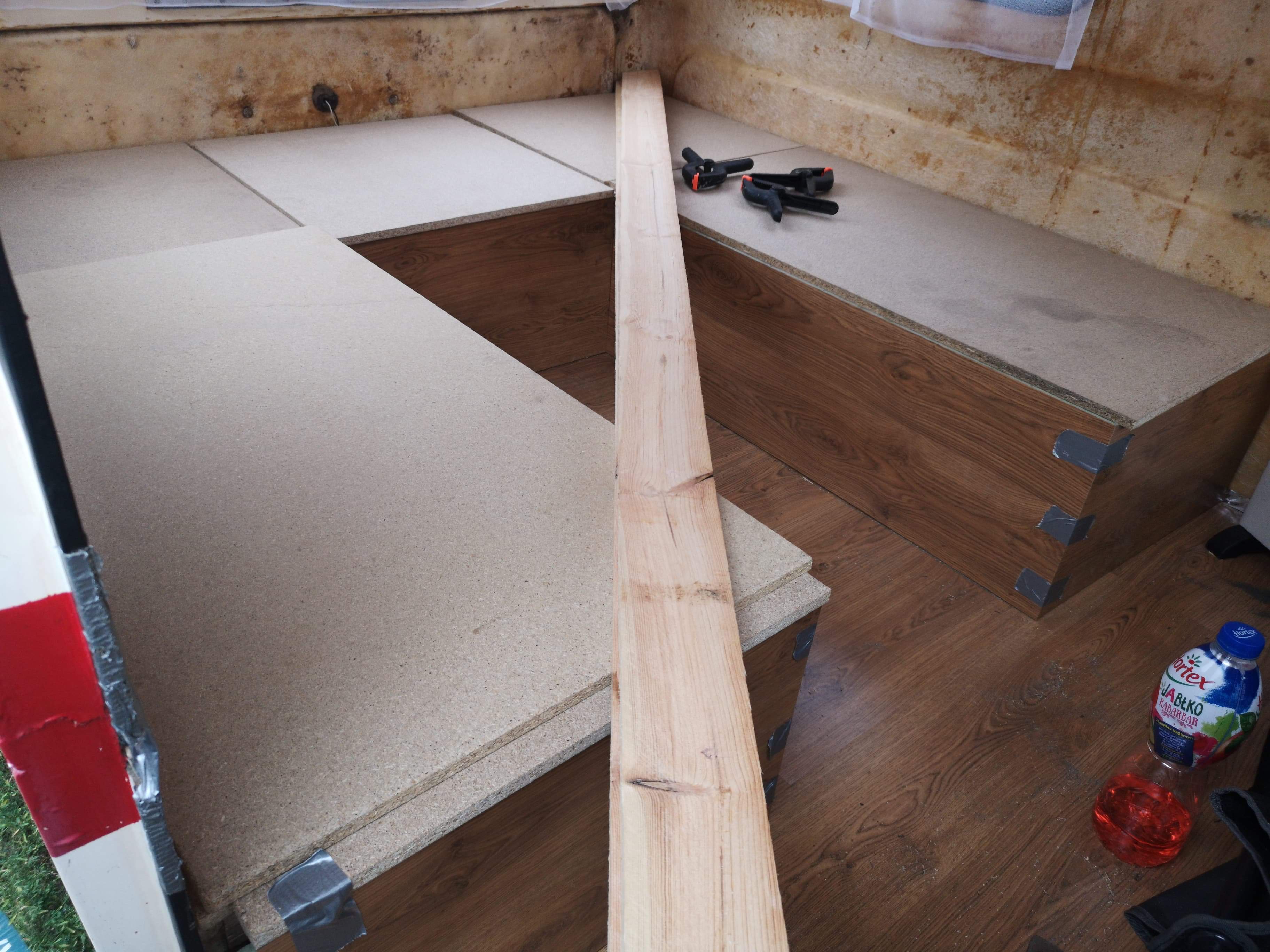Pracę wewnątrz rozpoczęte i chwilowo stoją, zrobiony stelaż łóżka, docięte panele pod kątem 45*, tak aby w narożnikach się schodziły, niestety ostatnio nie mam czasu tego skleić, skręcić.