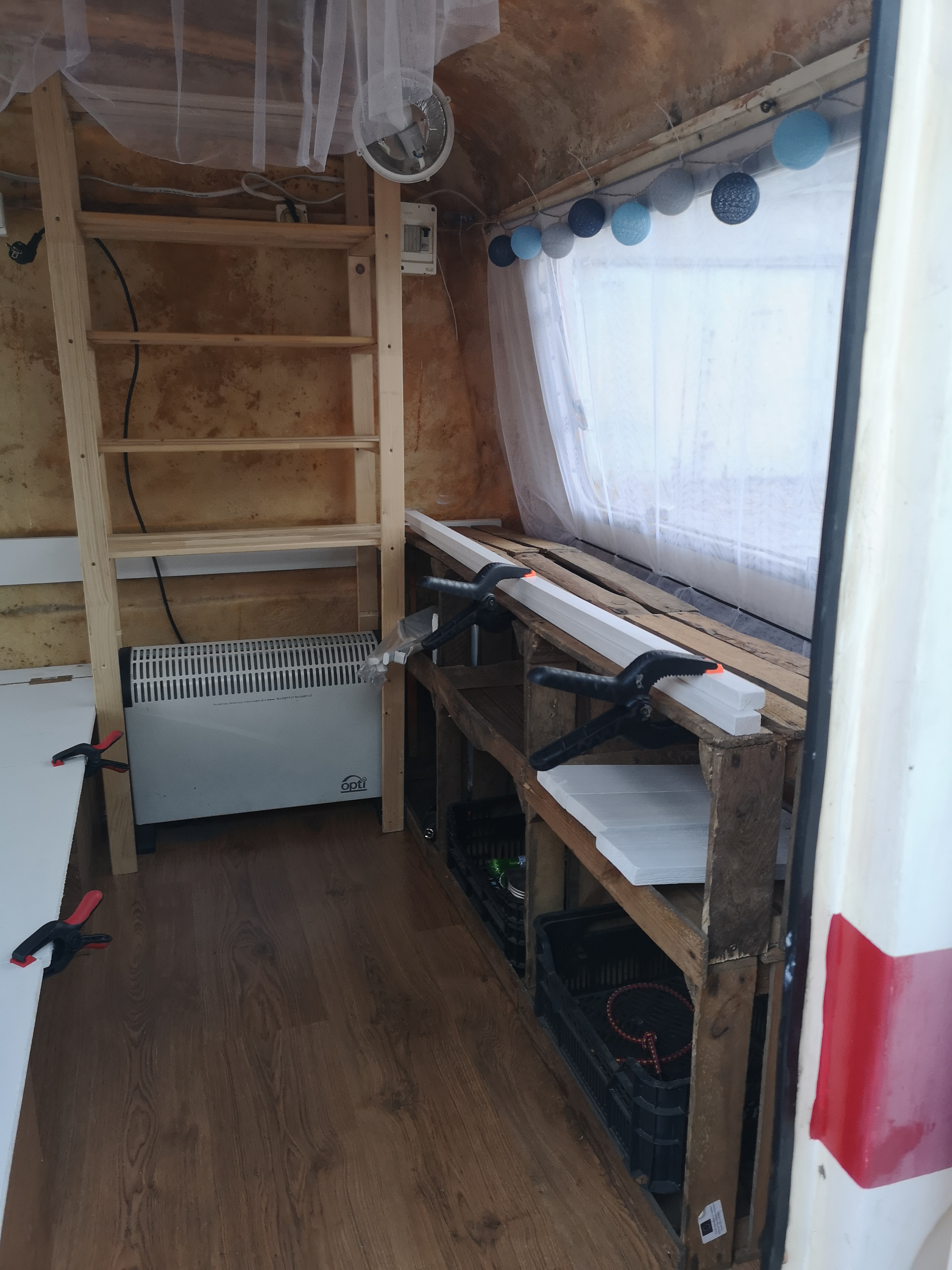 Podczas wyjazdu przeżyliśmy pierwszy mróz w przyczepie, w nocy temperatura spadła do -2 i dało to nam do myślenia że korzystając z przyczepy w sezonie letnim raczej zrezygnujemy z ocieplenia (w Czerwcu przeżyliśmy tydzień w +30, teraz w okolicy zera), grzejnik elektryczny 2000W i kołdra zapewniały wystarczający komfort termiczny, nawet przy rozszczelnionych oknach. Na ścianę trafi tylko wykładzina remontowa, przez chwile był pomysł aby środek pomalować farbą na biało i zostawić "surowy" laminat.