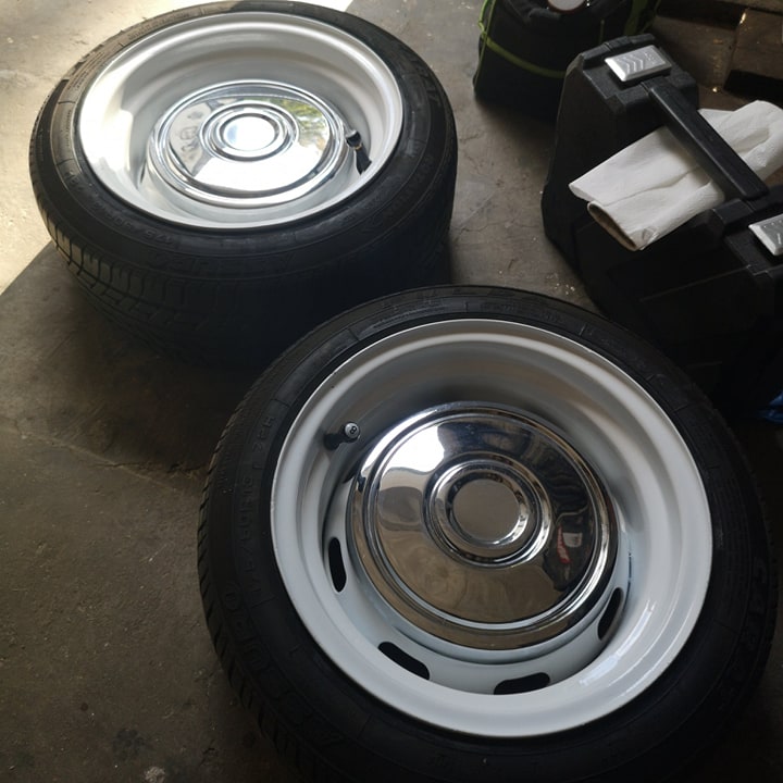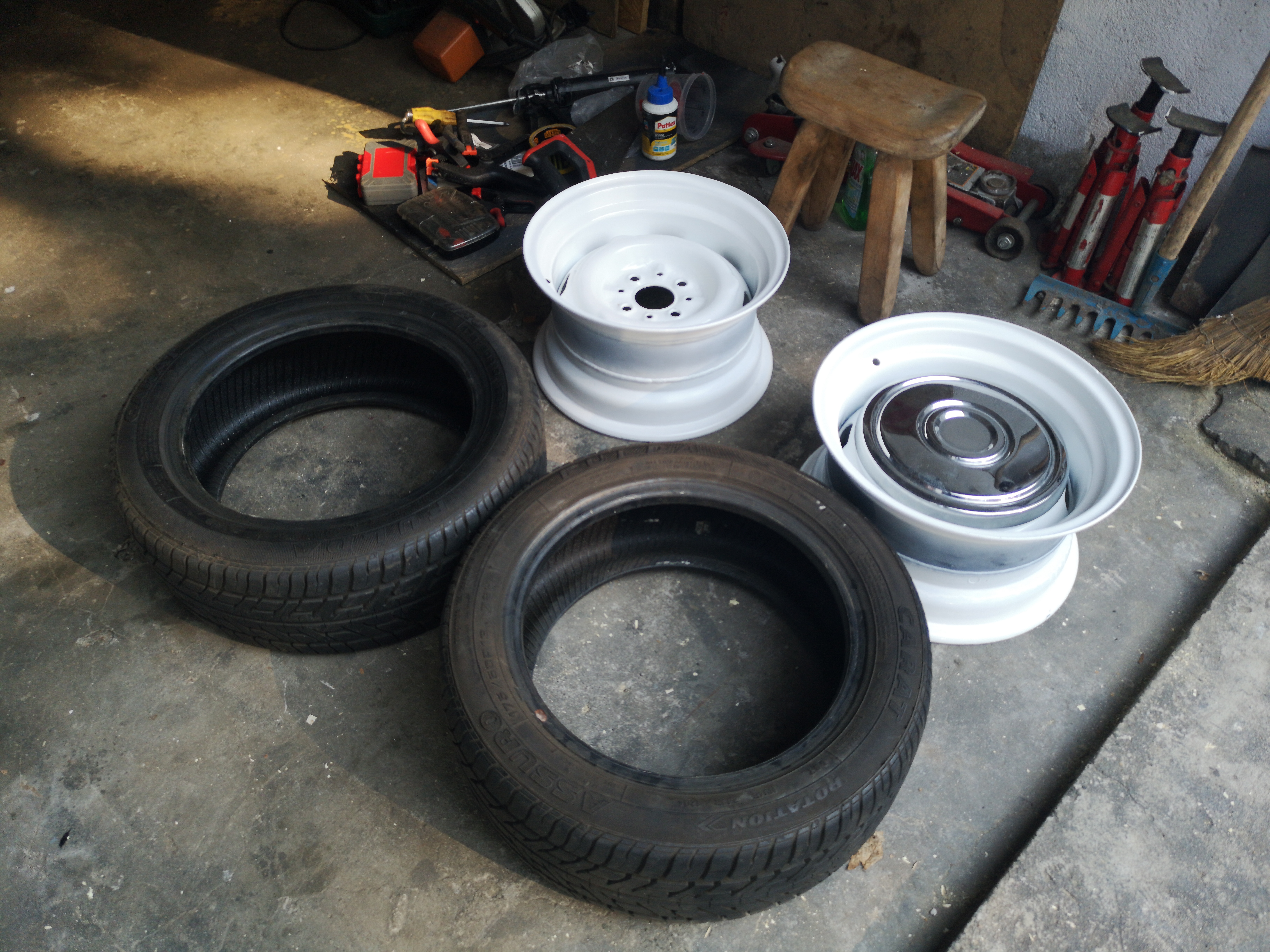 Docelowe felgi poszerzone w Benson Pro, 4.5j na 7j do tego opony 175/50r13 i chromowane dekielki 8-)
