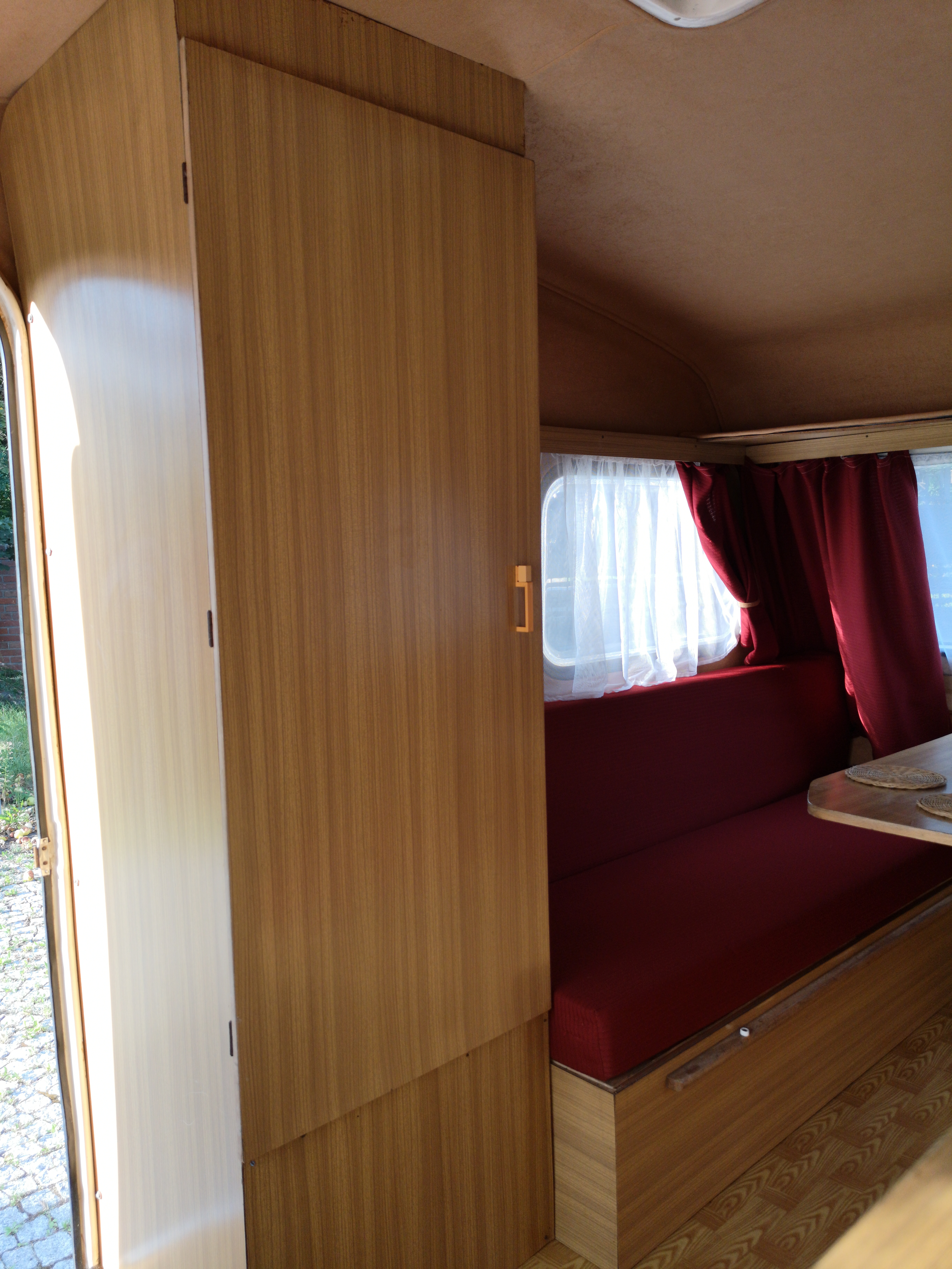 Jaki kolor tapicerki wybrać? Oryginalny bordo czy lepiej miodowy żeby rozjaśnić wnętrze przyczepy?