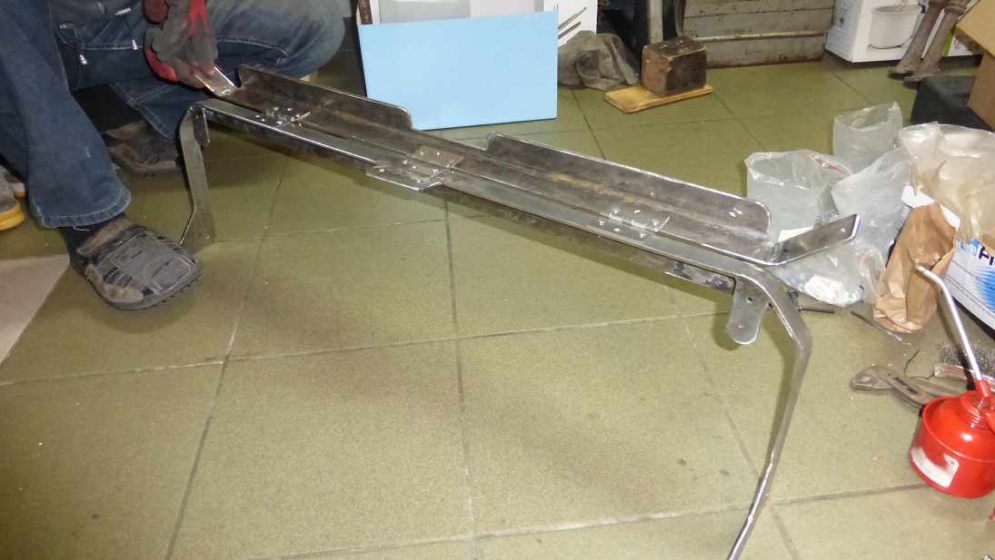 Wczorajsza robota to ostatnia już zabawa z żelastwem czyli stelaż pod butle. Jak wspomniałem wcześniej, ma on zapewnić delikatne pochylenie butli aby w górnej części nie znajdowała się niebezpiecznie blisko ściany przyczepy no i nie kolidowała z wklejoną w kufer siatką. Do budowy posłużył płaskownik taki jak do górnego pałąka, kątownik (też 30mm) oraz pręt gładki fi 8mm. Wyszło coś takiego, tak jakby ruszt. Pręty są po to aby butle można było porządnie zamocować przy pomocy pasów. Dzięki takiej konstrukcji butlę można postawić i przymocować w dowolnym miejscu kufra.