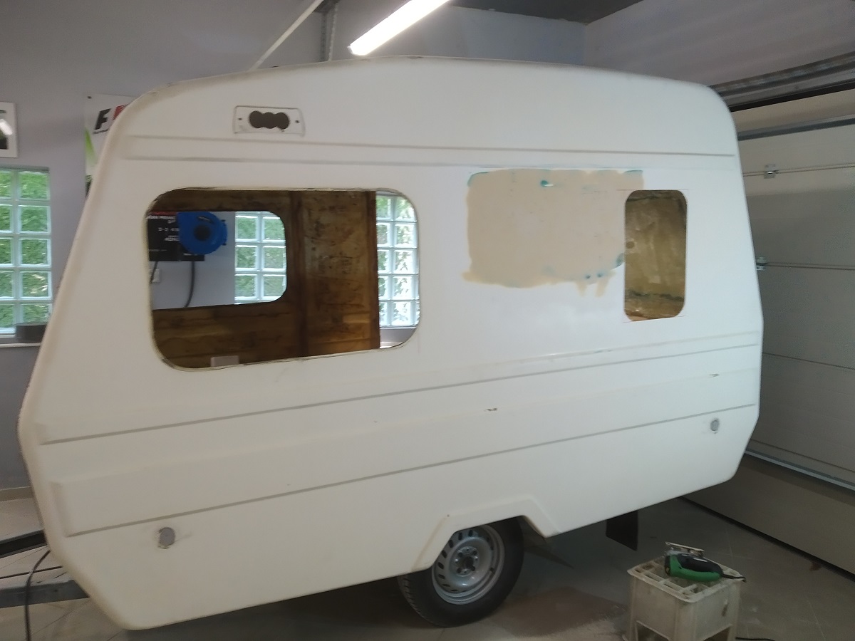 W najbliższych dniach (wieczorach) obrót przyczepy i walka z lewą stroną tj. wyrównanie miejsca po oknie kuchenym, już jest zalaminowane, i ogarnięcie otworu pod łazienkowe.