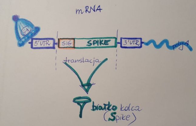 Szczepionkowa cząsteczka mRNA składa się z kilku regionów, podobnie jak inne mRNA powstające w jądrach komórek eukariotycznych (zdjęcie ze schematem). Każdy z regionów jest ważny i spełnia swoją ważną rolę, ale tylko w jednym z nich zapisana jest informacja o budowie białka koronawirusa.