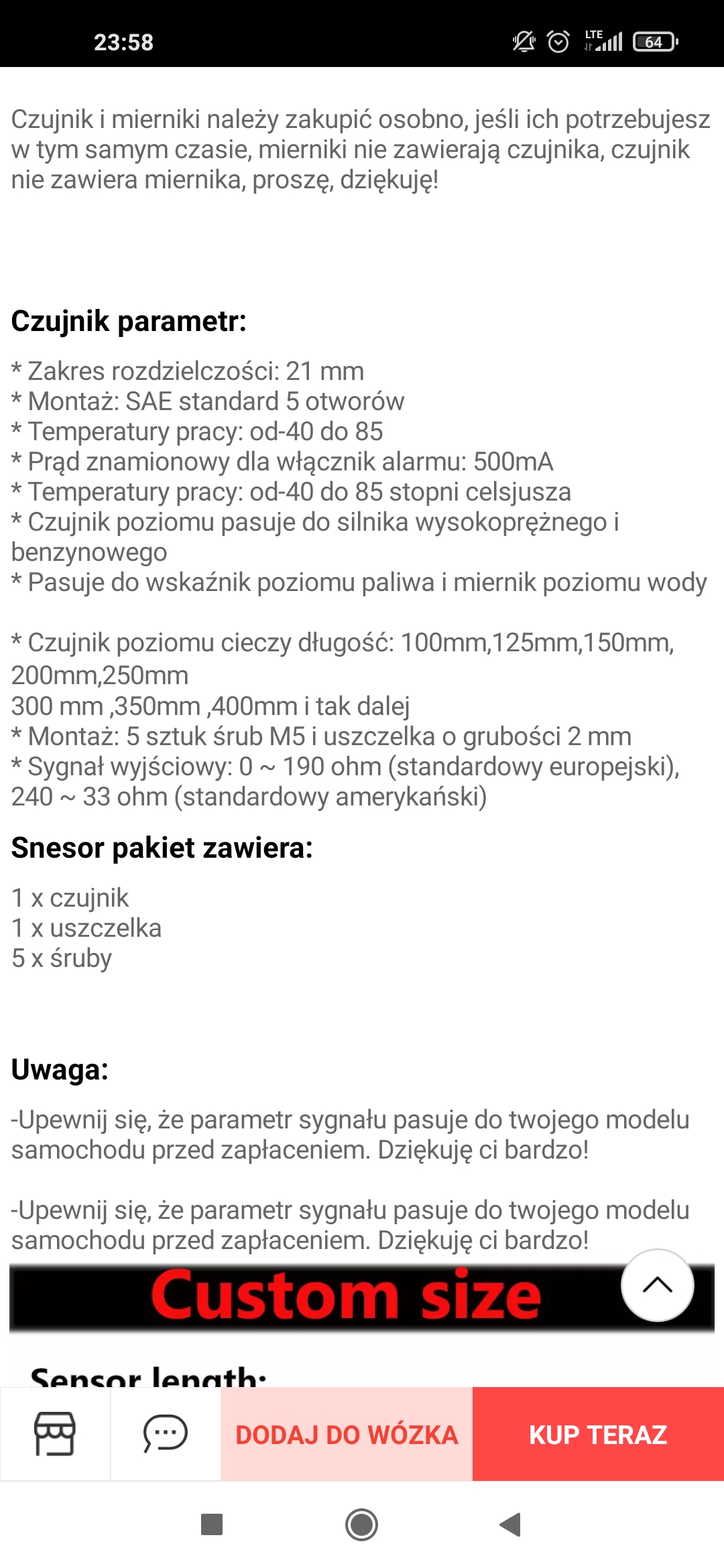 Długość czujnika w cm dopasowujemy do wysokości zbiornika i tyle, pozatym wlew kątowy 38mm, odpowietrzenie 16 mm, pobór 10 mm. Pytanie czy instalacja przepływowa z kranem z elektrowłącznikiem (w kuchence, obok zlewu ma Kolega otwór na montaż takiegoż tak, żeby szkło się zamykało) czy instalacja ciśnieniowa (z normalnym kranem jak w domu)?