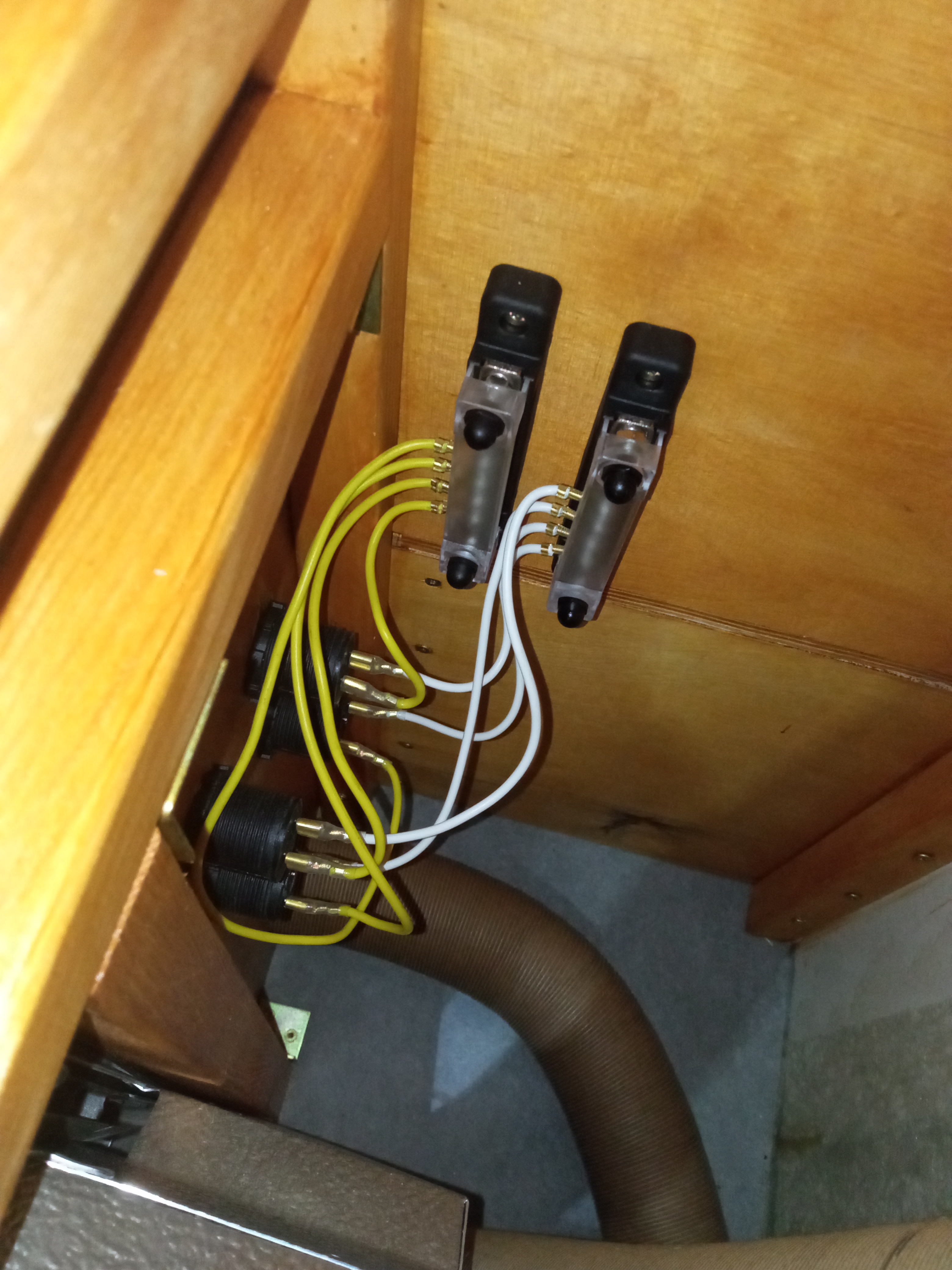 Czyli w sumie mamy w tym miejscu dwa gniazda zapalniczki, i 4 gniazda USB. Pozornie sporo, ale tylko pozornie. Wiadomo, gniazdek nigdy nie za wiele. Dwa telefony, czytnik Kindle, pewnie latarka. Dodatkowo będzie gniazdo USB u góry szafki z półkami, aby na bieżąco ładować głośnik USB. Gniazdko do gniazdka i potencjalny pobór prądu przez "szafkę z Trumą" może być spory. Aby uniknąć łączenia kabelków w pajączki, użyłem dwóch busbarów, do których zostanie doprowadzony kabel 4mm^2, i z nich rozchodzą się przewody do poszczególnych gniazdek.
