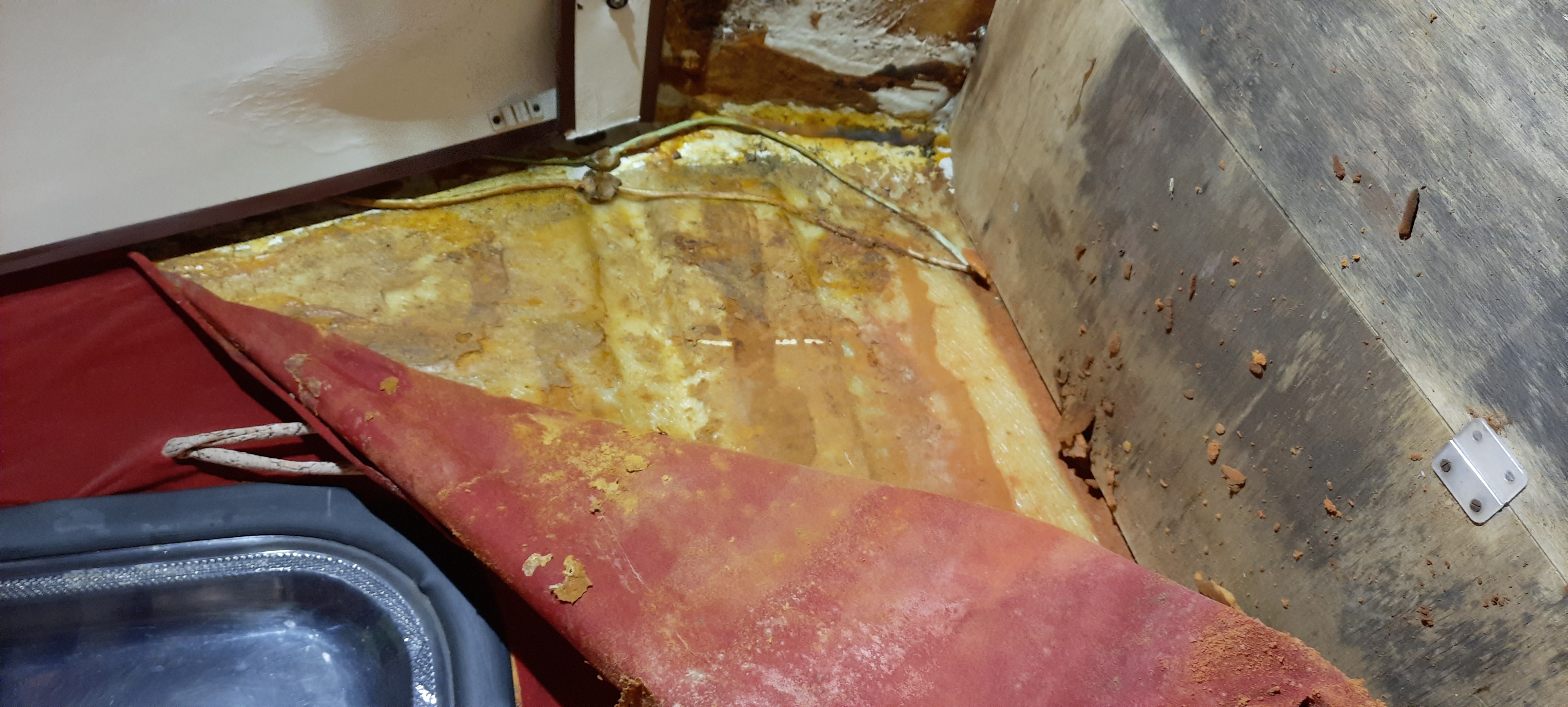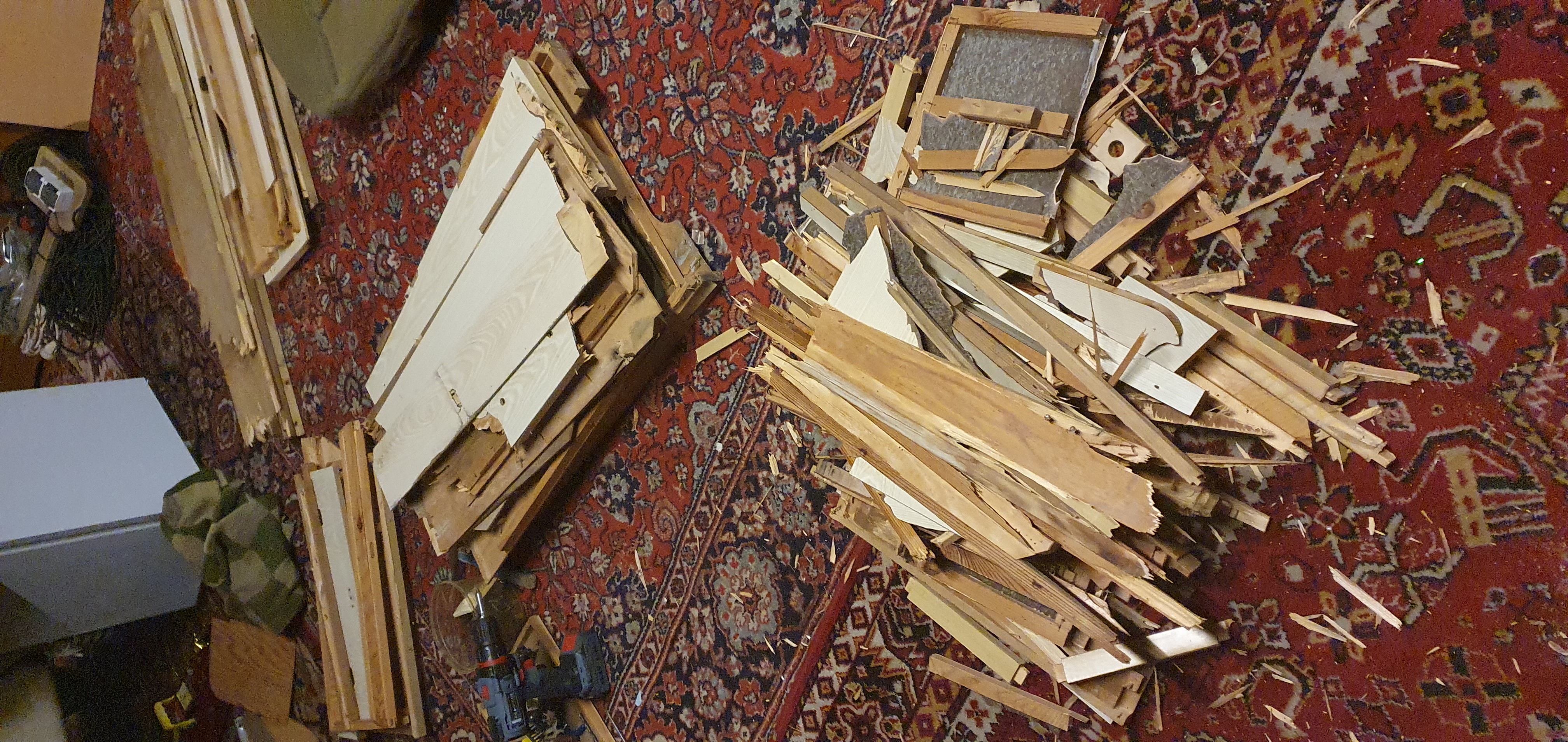 Przyczepka zakupiona w 2019r. cała w oryginale, przednia szyba lekko pęknięta po środku, zaklejona klejem na gorąco, kuchenna również uszkodzona, naprawiona drutem miedzianym, tapicerka w słabiutkim stanie. Szybka wymiana szyb, uszczelnienie taśmą butylową i po ogólnym ogarnięciu nadawała się do użytku. Kilka wyjazdów zrobionych. Myśl remontu kotłowała się w naszych głowach od samego początku, lecz zakres prac zmieniał się jak pogoda w marcu. Studiowanie wątków remontowych i ogólny mętlik. Co zmieniamy, co zostaje? Podjęliśmy decyzję, że robimy wnętrze po swojemu. Tapicerka, łóżko podwójne, stałe, podnoszone, meble w całości od nowa, mały stolik i pojedyncze łóżko zostaje po staremu. Wreszcie w październiku 2021 doszło do całkowitej demolki.
