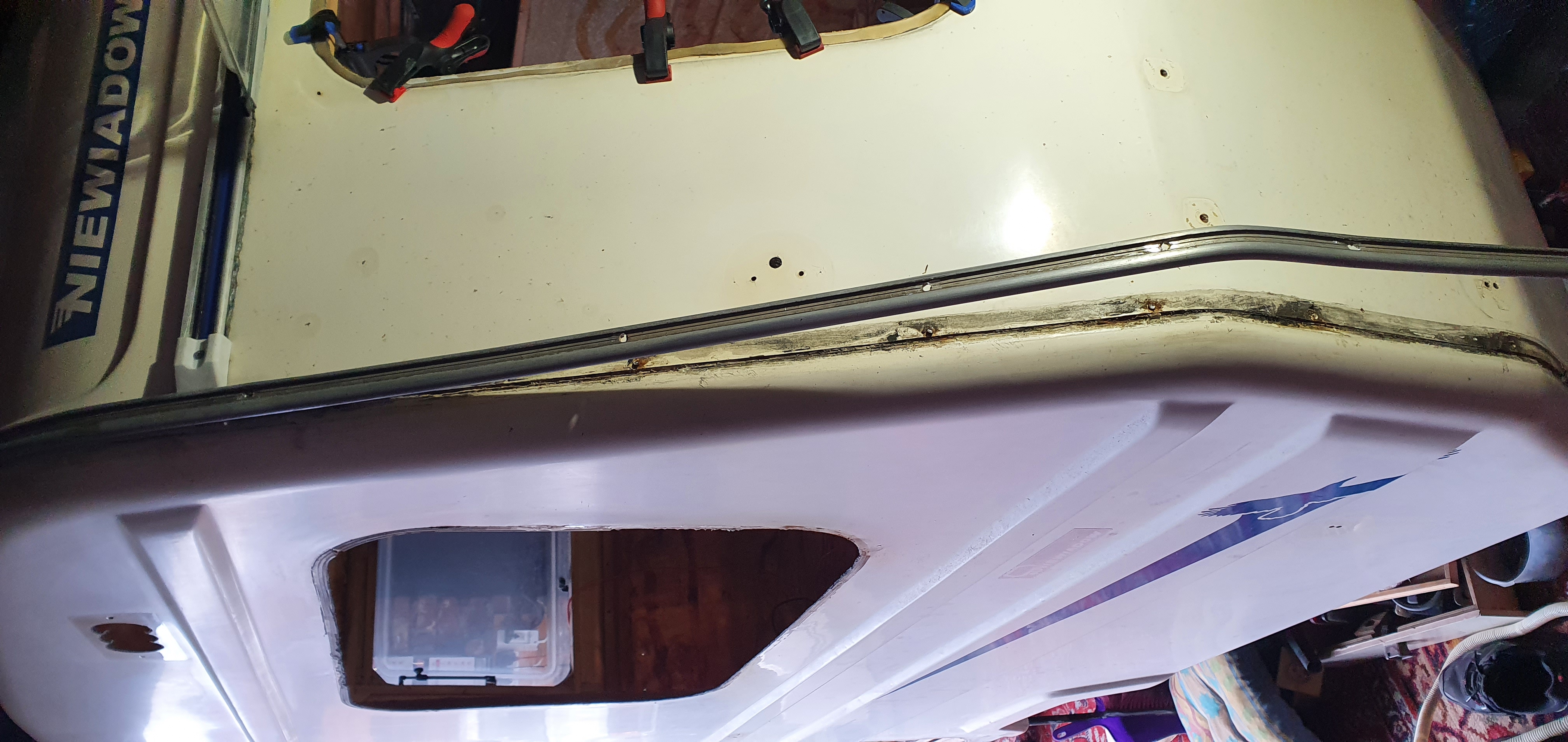 Listwy zdjęte, wg moich obliczeń potrzeba 50 szt śrub M4x15, nakrętki M4, plus podkładki powiększone 12. Oczywiście będą w nowych miejscach. Montaż na taśmę butylową, ale wcześniej trzeba przeszpachlować nierówności i czymś zabezpieczyć, szczególnie na zakolach. Otwory od środka zrobię żywicą. Co do okna dachowego to temat otwarty, w piątek jadę do Intercampu (Grodzisk Maz.), mają spory wybór. Karolu, kominek jak najbardziej przyjmę. O-ring do rury wylotowej dogadany z Kubą.