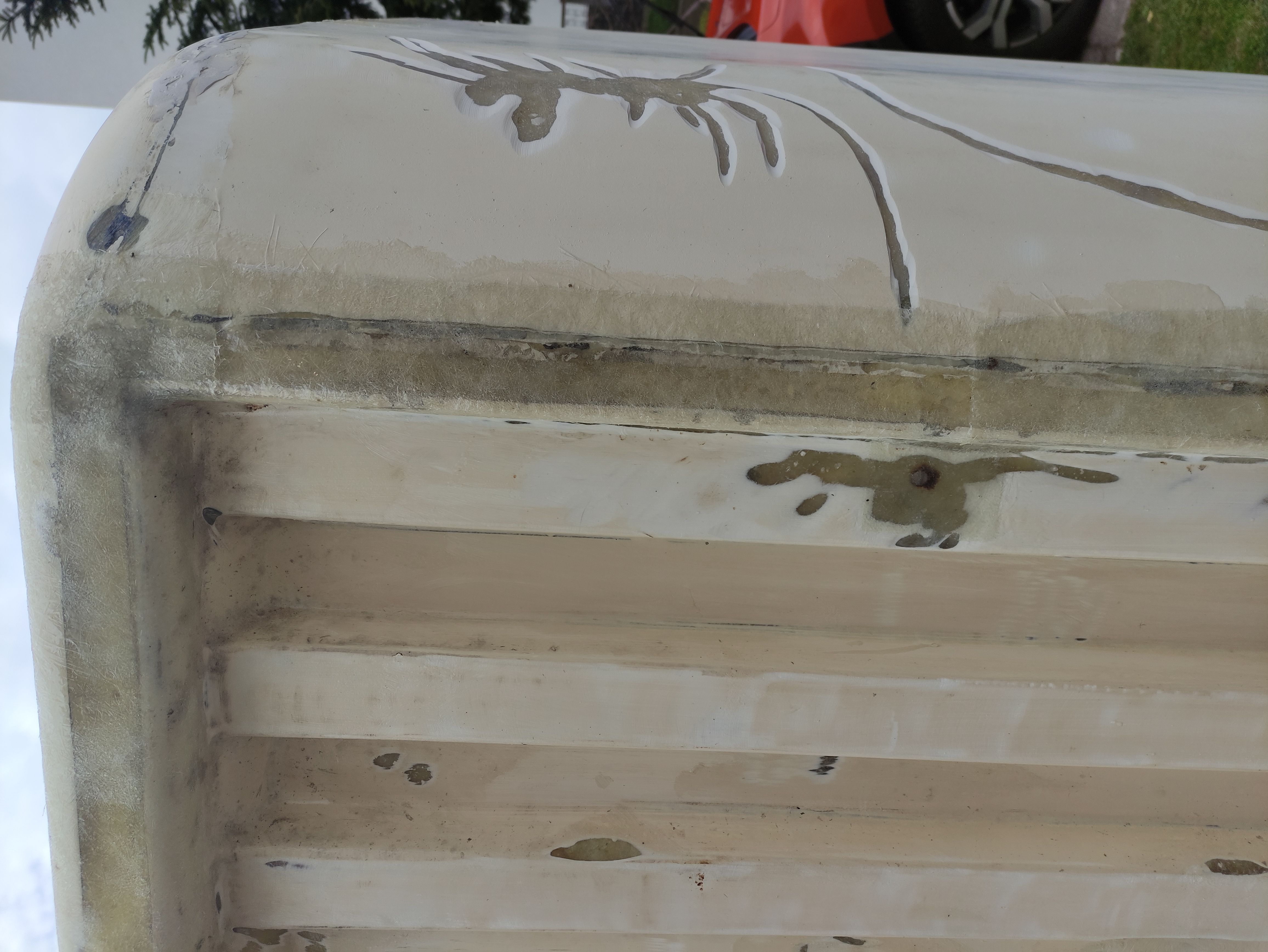 Ogólnie jestem jeszcze mile zaskoczony połączeniem kleju szpachlowego z mączką dolomitową. Zakleiłem nimi takie większe dziury i jest to niesamowicie twardy materiał; myślę, że kilkukrotnie twardszy od żywicy plus mata; ciężko w ogóle to zeszlifować. Myślę, że potem położę taką warstwę w w/w miejscach.
