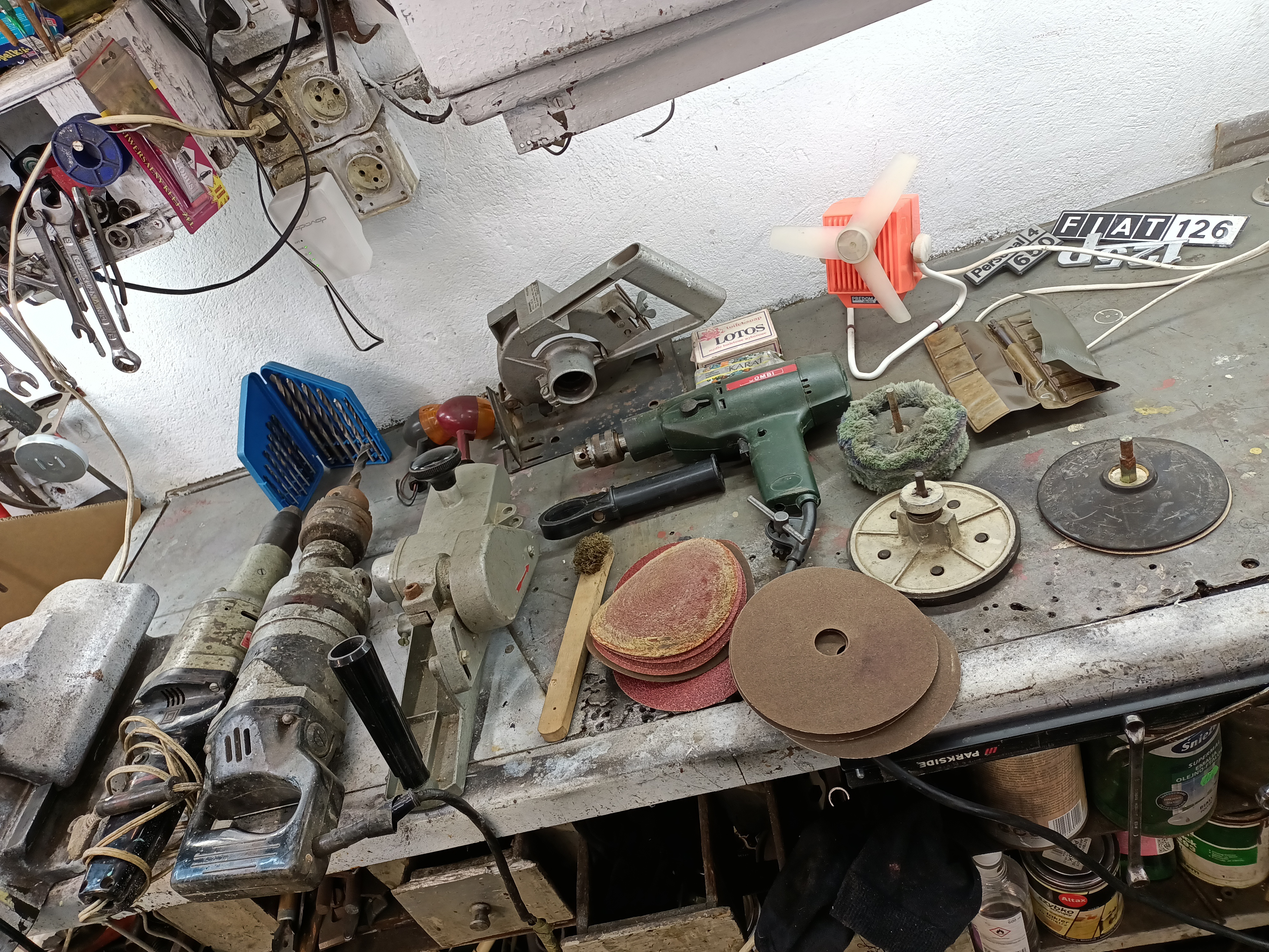 Bagnetówka uszkodzona, pewnie kondensator, duża ma zepsuty wyłącznik, ale działa, mała i przystawki OK. Były jeszcze nasadki udarowa, szlifierska i ostrzałka do wierteł, ale gdzieś się pałętaja po cepce. Do tego mydełka i kierunkowskazy do "Komara" :D i "Zefirek" :D