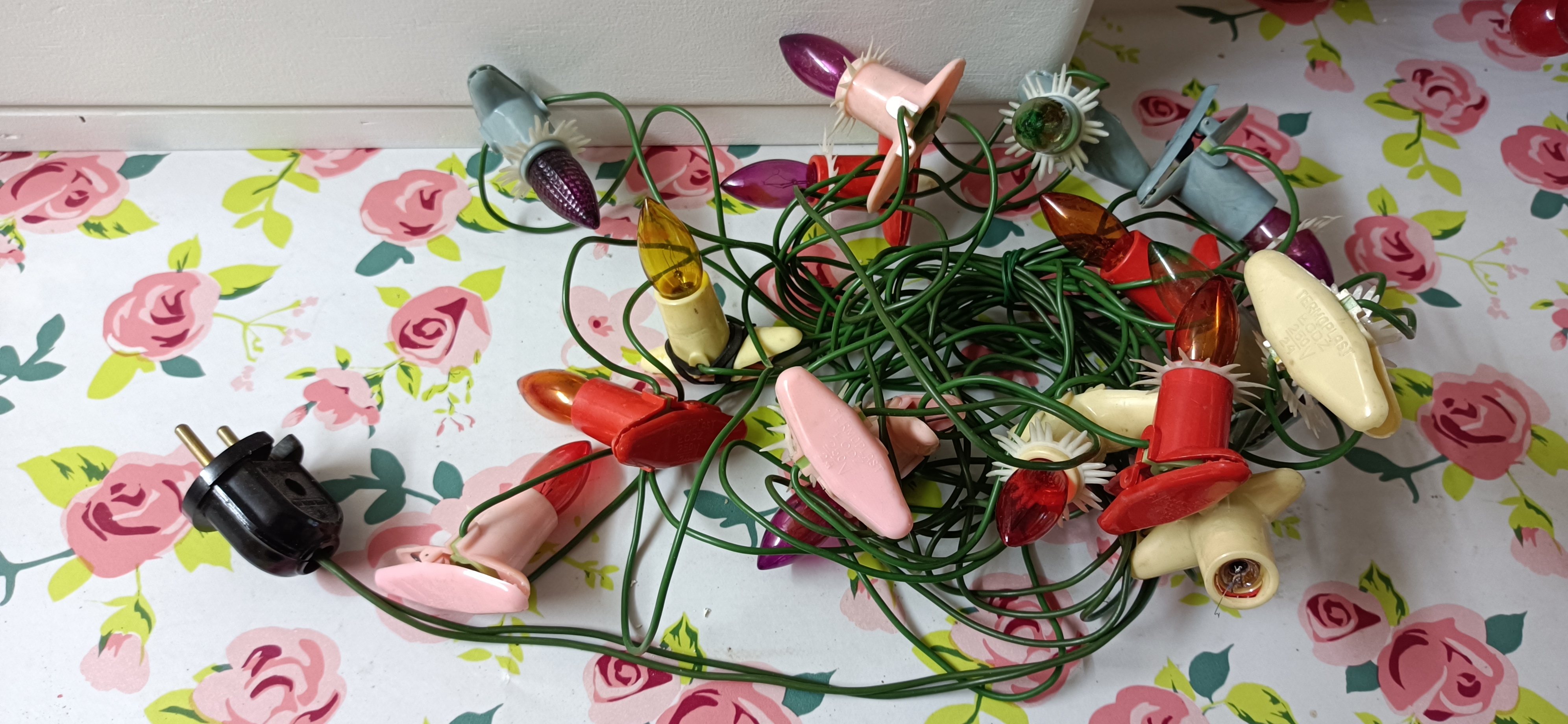 Kultowe lampki świeczkowe na choinkę. Wystarczy uzupełnić żarówki;-). Nawet bakelitowa wtyczka już przycięta pod bolec uziemienia.