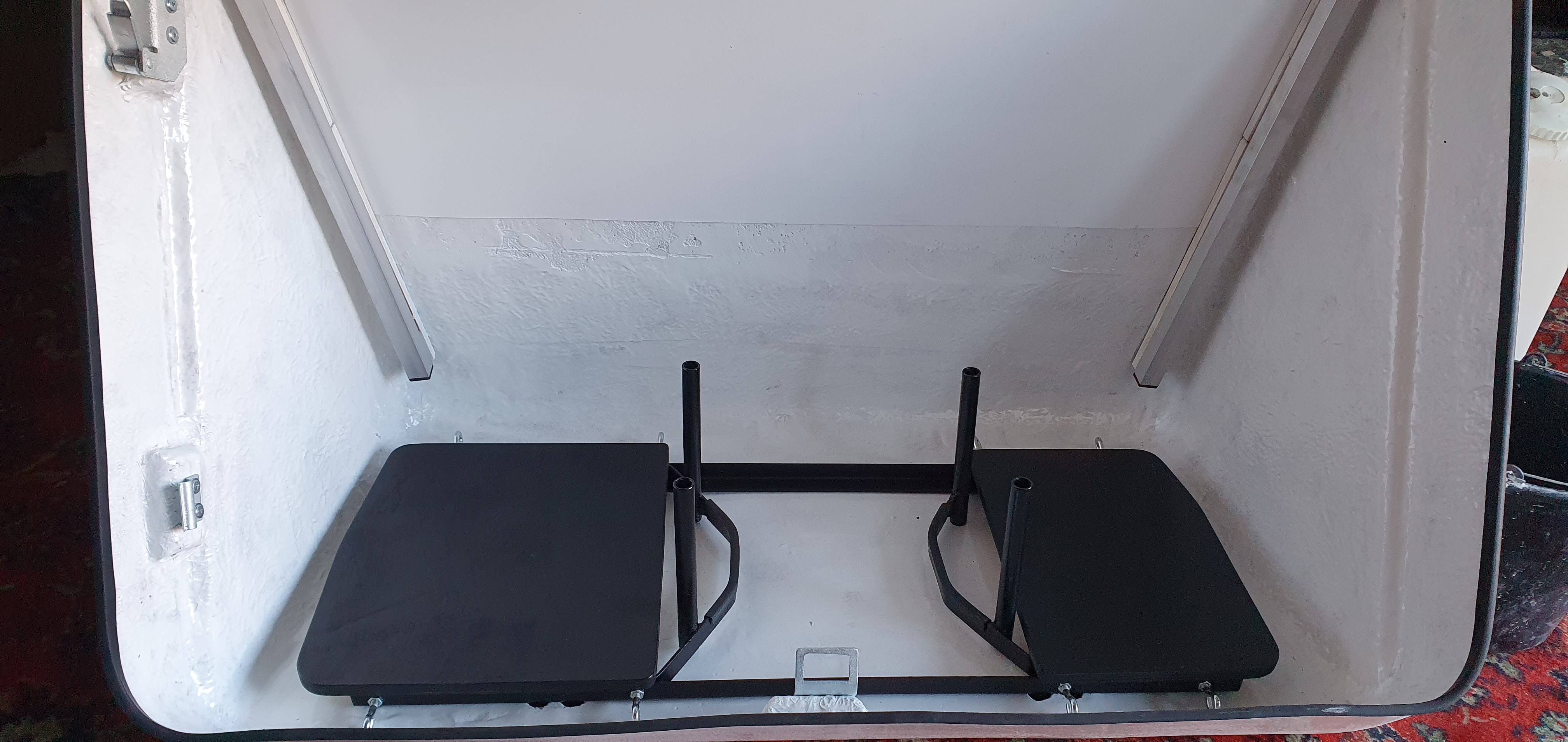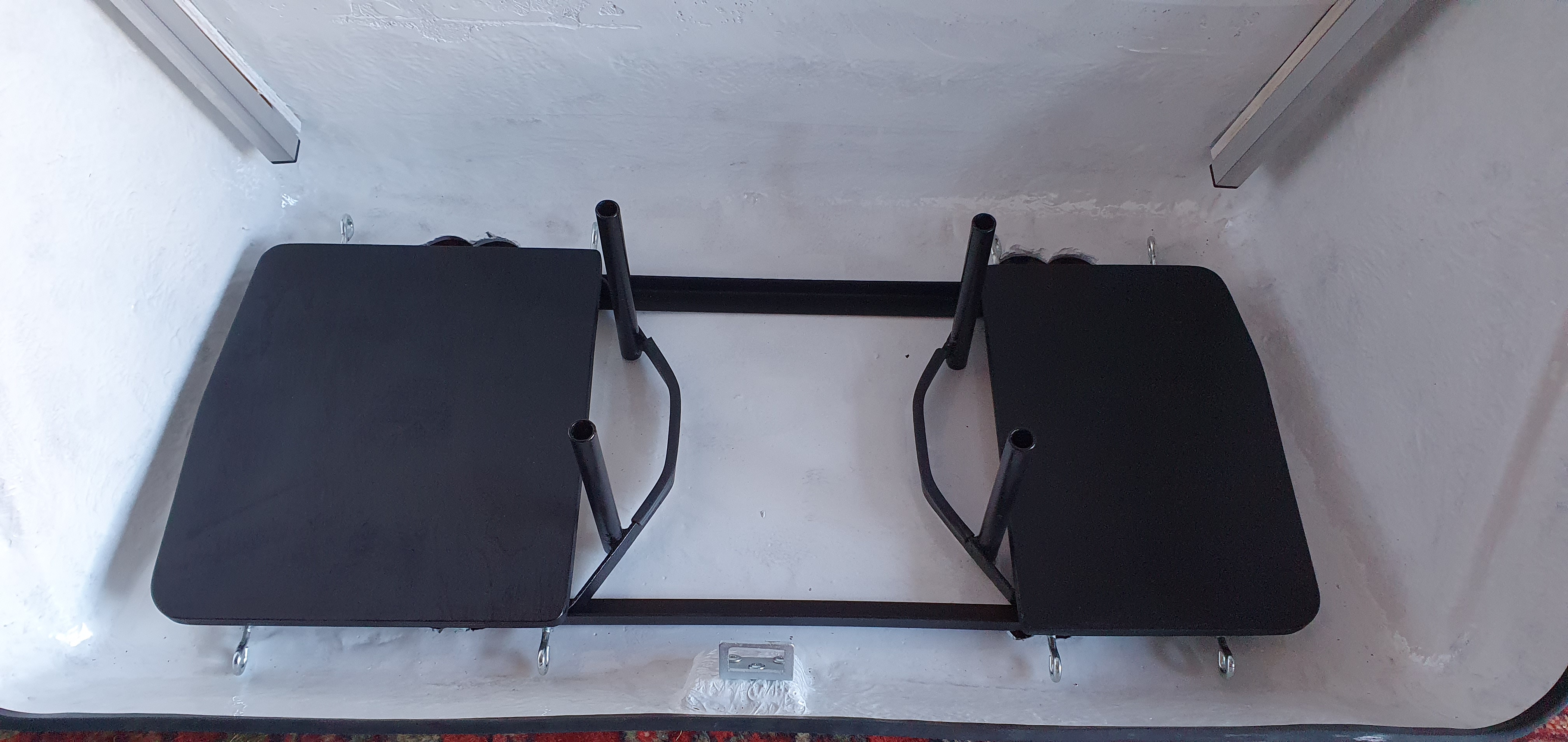 , nadał się idealnie. Całość skręcona i uszczelnione taśmą butylową. Kosz na butle zrobiony pod swoje potrzeby, podstawa na kątowniku stalowym 20x20, miejsce na dużą i małą butlę oraz baniak wody. 8 oczek do mocowania. Wpadnie jeszcze gniazdo 230v do grzałki wody. Ośka miała być nie ruszana ale przy demontażu hamulca/druta podjąłem szybką decyzję o zdjęciu i dokładnym przeglądzie. Szczęki i łożyska jak nowe. Całość wyczyszczona i odświeżona, bębny poszły w najszybszy kolor