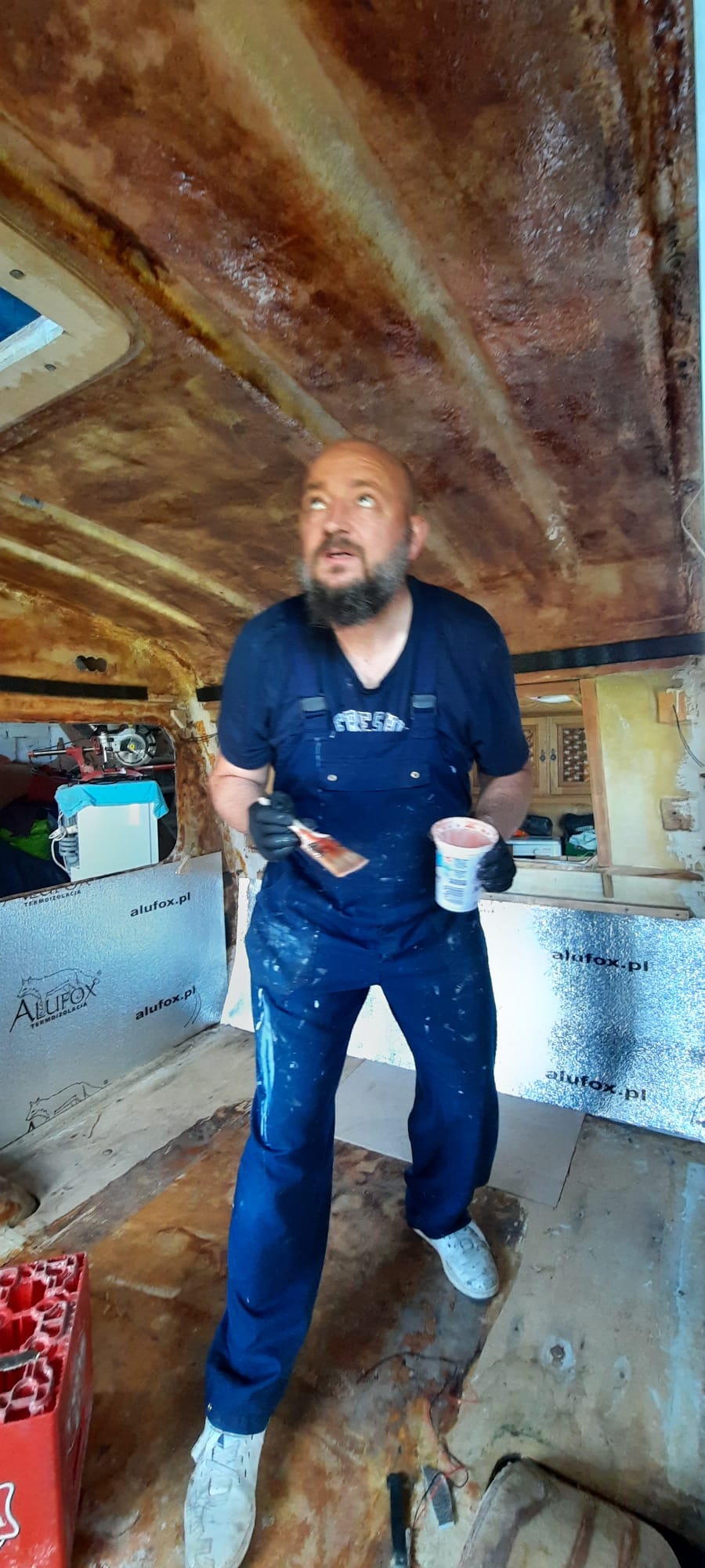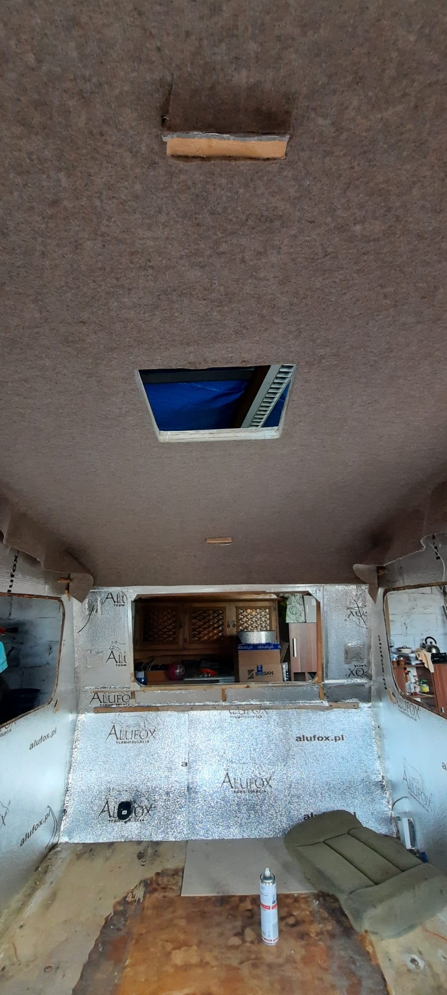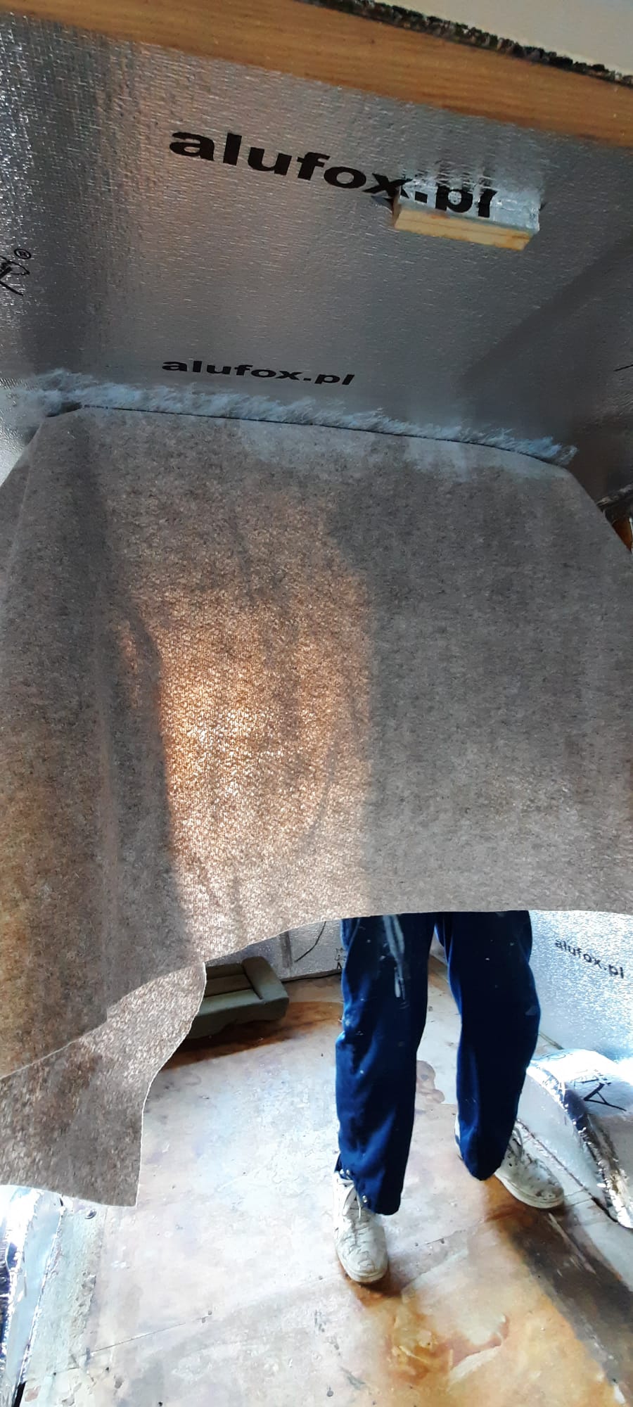 Dzień spędzony na zaklejaniu łączeń izolacji i przyklejaniu największego płata tapicerki. Tym razem bez pędzla