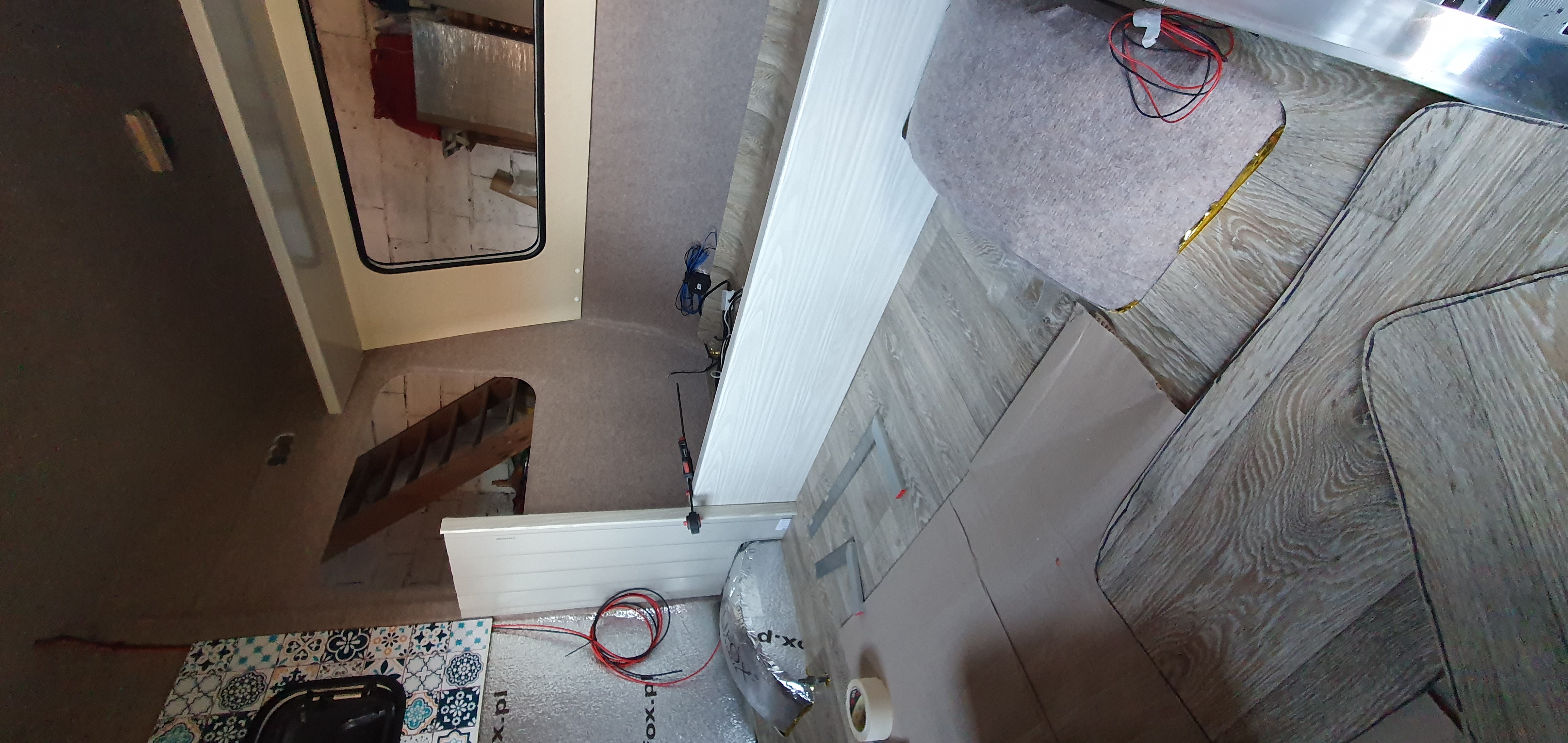 Wkręty w drzwich zamaskowane, dorwałem pasek gumy i go przyciąłem na odpowiednią szerokość, naciągnięty i na dole złapany wkrętem. Oświetlenie zewnętrzne ogarnięte. Na podłodze folia grzewcza. Panele przy oknach otwieranych zamontowane. Męczę się z białym klinem bo rurki miedzianej nigdzie nie udało się dorwać