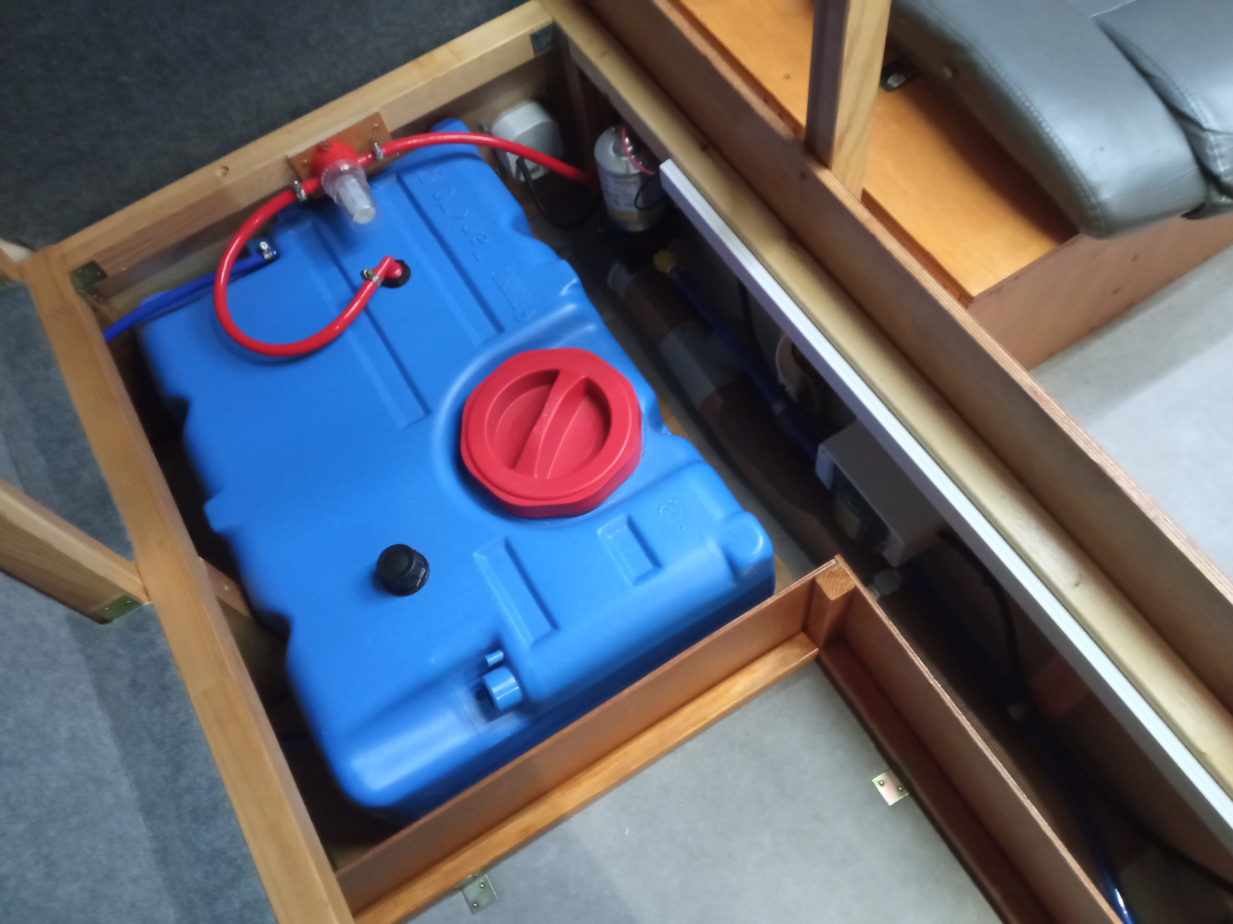 Kran tak jak wcześniej wspomniałem to bateria cywilna z obi. W instalacji wodnej jest zamontowany filtr oraz zawór spustowy. Niestety nie ma jak zamontować ściennego gniazda napełniania zbiornika wody, więc póki co trzeba będzie wsuwać wąż z wodą przez tylne drzwi, pod stelażem materaca. Zobaczę czy to będzie bardzo karkołomnie do wykonania, ale też jestem tu zblokowany tym że muszę wyjechać autem z garażu, no chociaż dziubkiem auta