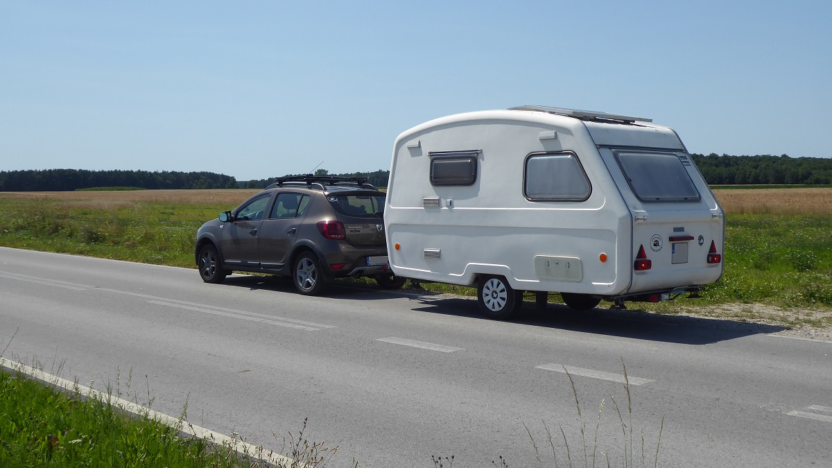 Przyczepa elegancko i równiutko stoi za autem, nieco wyżej niż stała na poprzedniej osi. Dla przypomnienia, opony to 165R13 czyli pełny profil. W chwili robienia zdjęcia ciśnienie 3,0 bara a na pokładzie jest niemal wszystko, łącznie z 3/4 pełną 11-ką. Do naszego pełnego wyposażenia wyjazdowego brakuje jedynie dobrze znanych wszystkim krzeseł i stołu, żarcia w lodówce oraz... tronu