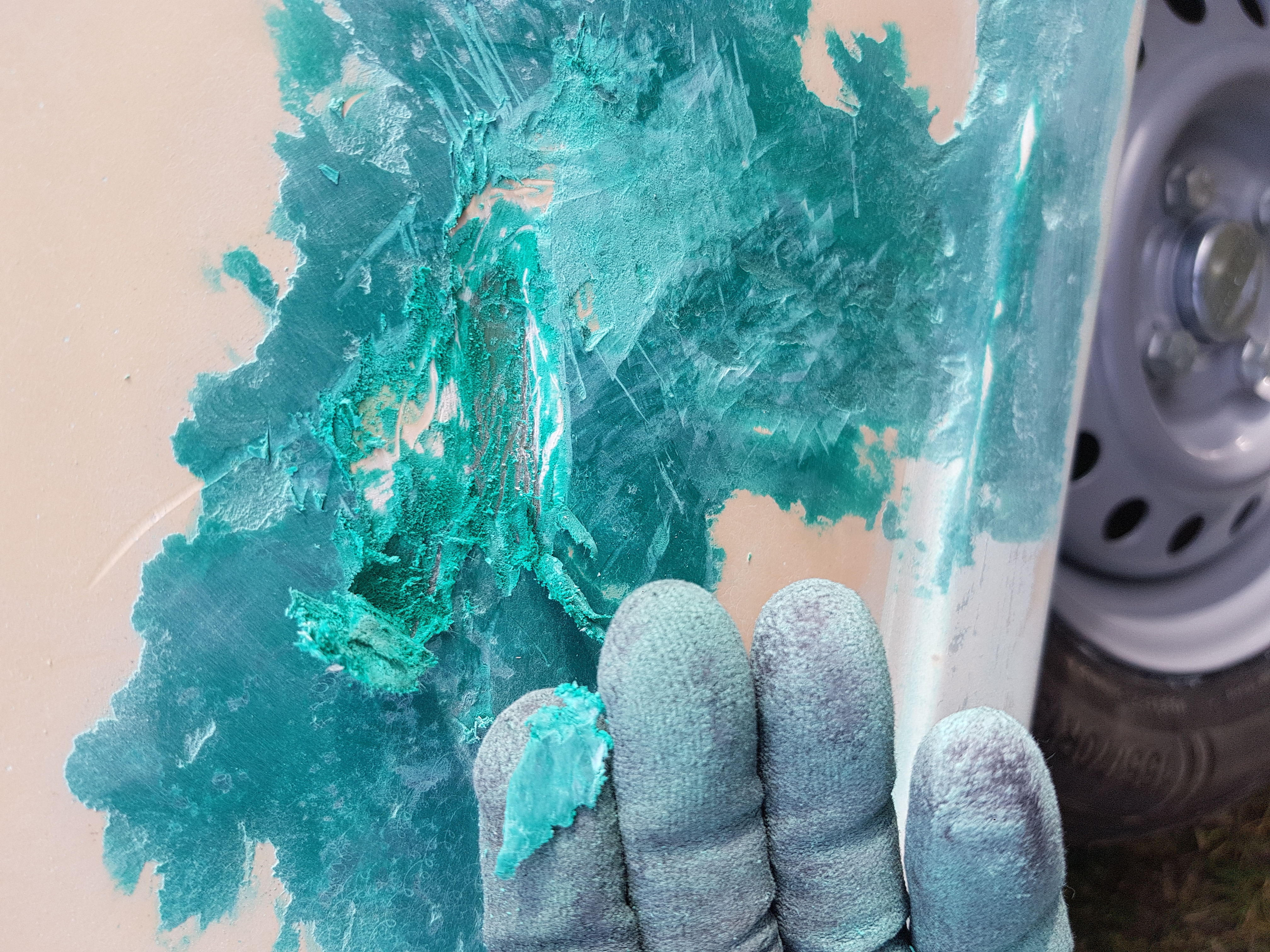 Witam po zimowej przerwie. Wraz z ociepleniem klimatu ruszają prace przy campingu. A to przymiarki brodzika a to próby klejenia alufoxa i tapicerki no i oczywiscie dalsze szlifowanie zielonej szpachli Boll-a. Ale przecież nie może być tak łatwo i prosto. Serio nie rozumiem o co chodzi z tym zielonym wynalazkiem. Szpachla była kładziona przy temperaturach dodatnich na początku października jeszcze przy słoneczku. Wyrabiana według zaleceń producenta przy proporcjach podanych na opakowaniu przy użyciu wagi co do grama, miejsca kładzenia szpachli wyczyszczone i odtłuszczone i cholera w większości miejsc jest twarda jak skała i nadaje się do ścierania a w innych miejscach do tej pory ma konsystencję plasteliny, normalnie schodzi pod paznokciem. Czy ktoś z Szanownych Forumowiczów miał podobną sytuację albo wie o co tu może chodzić? Bo ja nie mam pojęcia i zaczynam grzecznie mówiąc sobie włosy wyrywać. Co teraz z tym dalej robić? Zacząłem to wydrapywać ale tak pół przyczepy drapać to woła o pomstę do nieba. Może znacie jakieś środki chemiczne żeby się tego pozbyć ale żeby mi laminatu z budy nie rozpuściło? Nie wiem, serio nie wiem co z tym fantem robić. Poniżej kilka zdjeć problemu z którym walczę. Pozdrawiam.
