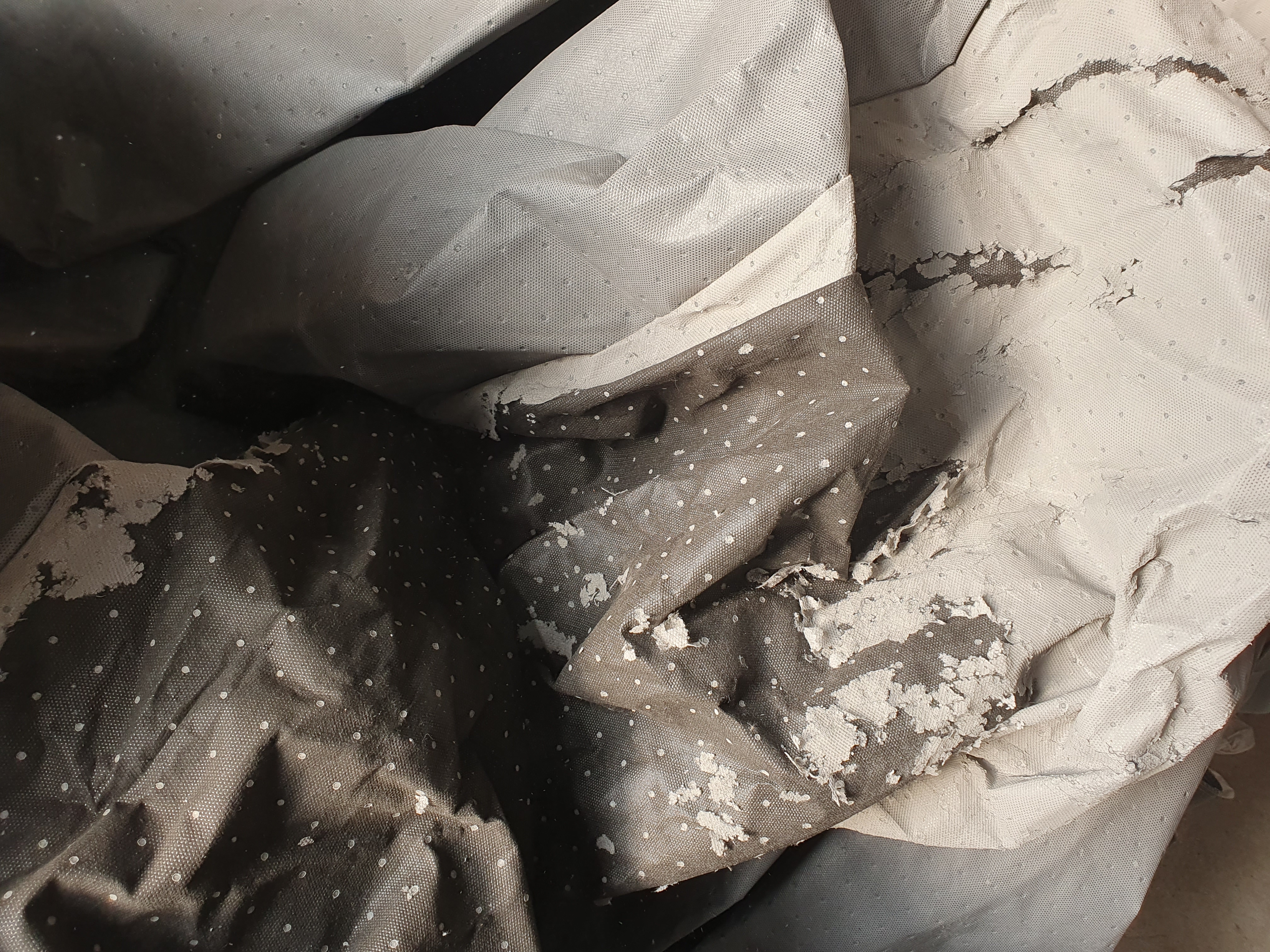 Dostałem informację (nie od producenta, z którym się nie kontaktowałem), że: "Takie zniszczenia powoduje słońce i promienie UV. Tkanina była bez tych dodatków i się po prostu spaliła."