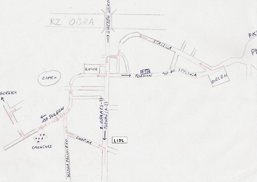 Poniżej mapka dojazdu zrobiona bez zdolności, ale każdy trafi. Na rysunku: dolny wjazd z południa (S-3, A-2), górny z Gorzowa, a prawy (pks, pkp) od Poznania, jesli ktoś nie jedzie autostradą. Dalej po czerwonych strzałkach. Sorki za "grafikę", ale ołówkiem było mi szybciej przerysowac mapę.