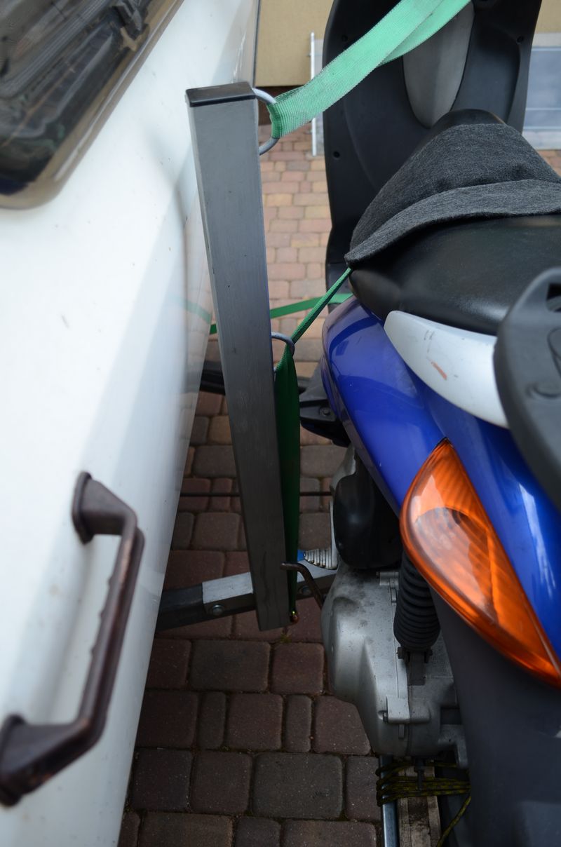 Mocowanie rynny motocyklowej na 2 śruby do ramy, do ramy przykręcony kawałek profila (słupek ogrodzeniowy) poprzez kątownik skręcony do ramy. Do słupka dospawane są 2 przelotki na pas transportowy. Jedynie trzeba złożyć lusterko i dobrze ponapinać pasy. :).
