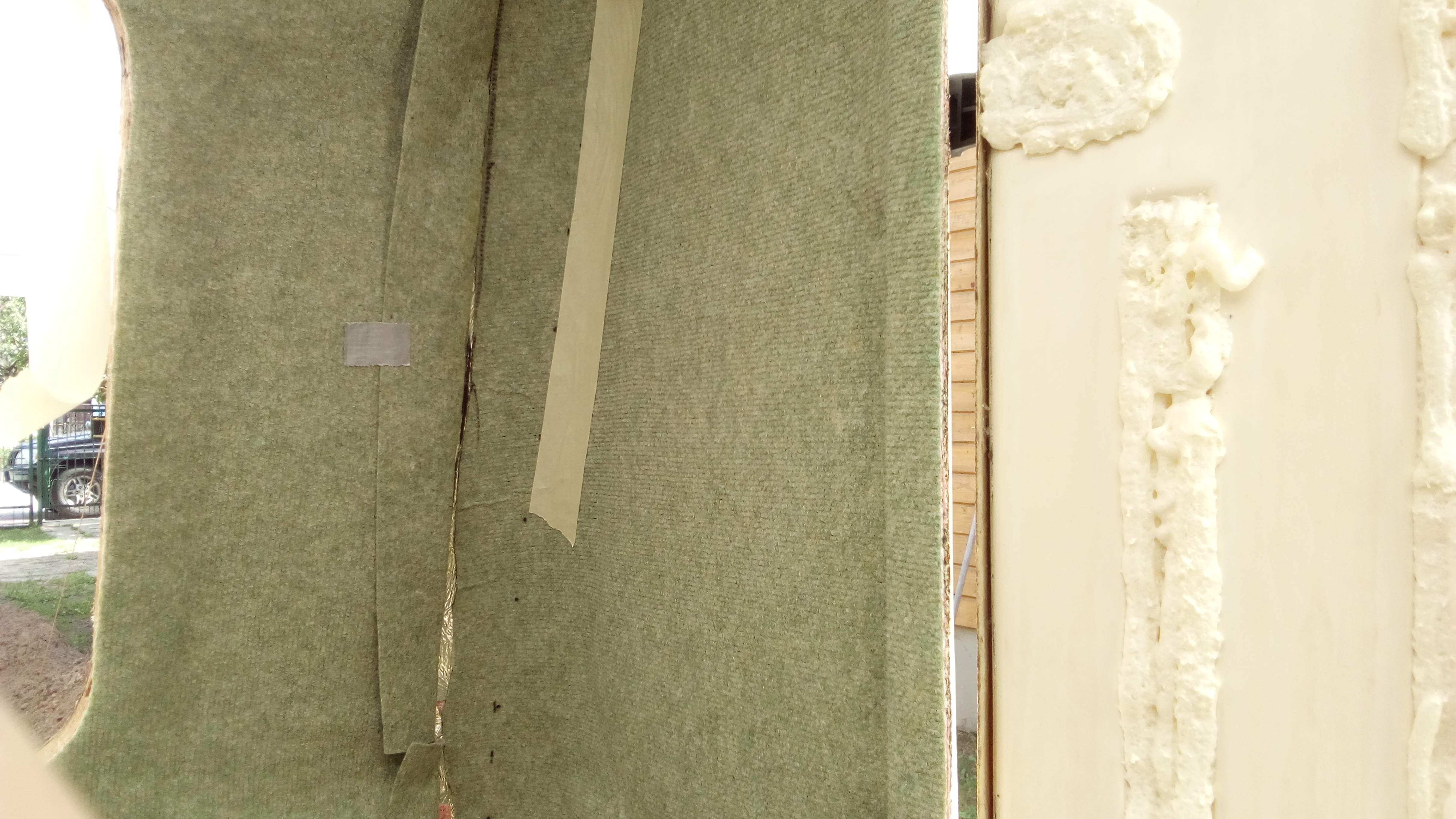 Ogólnie zostały mi się do wyklejenia wykładziną drzwi, nadkola, te 10 cm ścianki co otwierany dach na nich leży oraz sam szyberdach. Szyberdach mam zamiar wziąć na poddasze nieużytkowe (ale ciepłe, obecnie około 20 stopni C) i tam go trącić jeszcze topkotem, a potem wykładzinę na niego nakleić. Ale reszta to nie wiem, pogoda nie sprzyja, jest zimno, po pracy ciemno ...