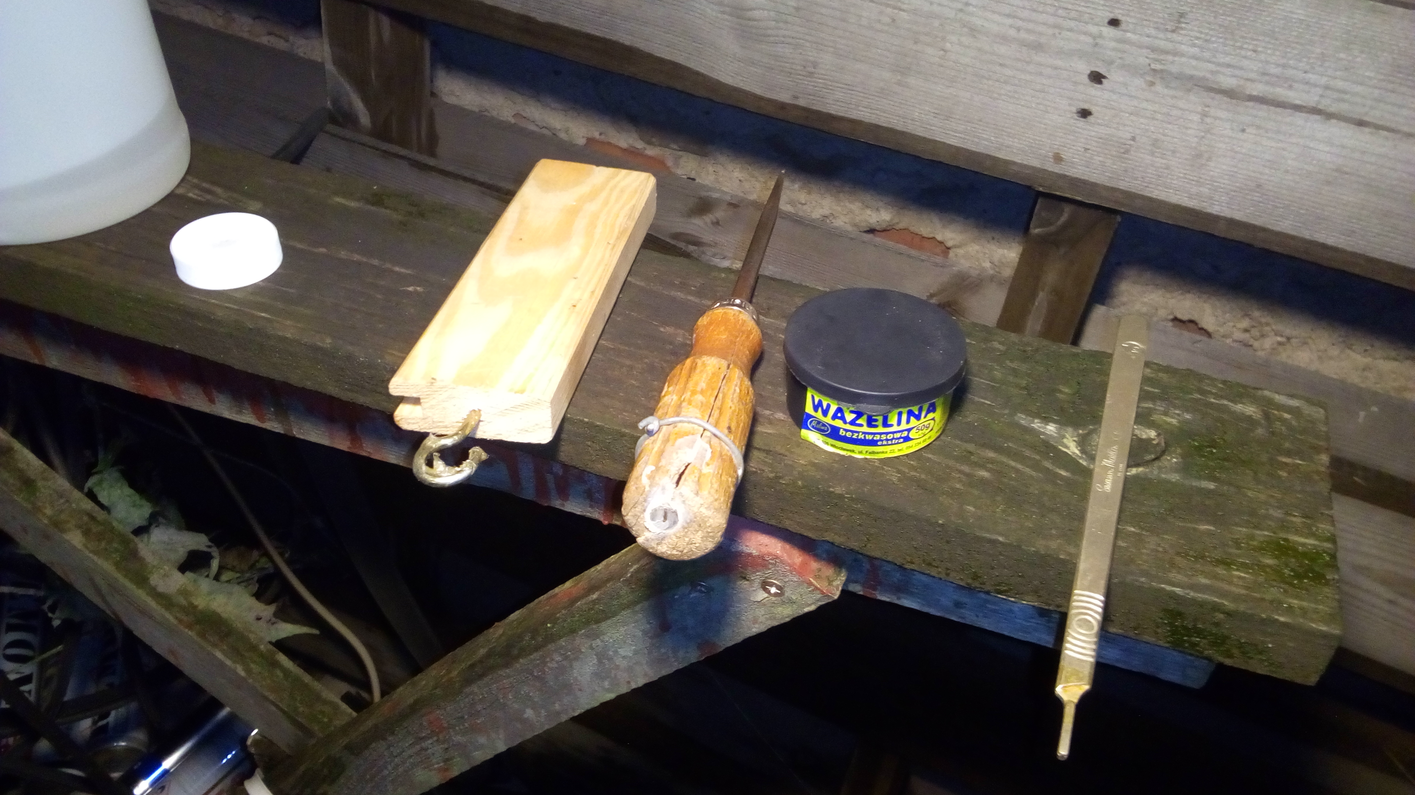 Duży płaski śrubokręt był do smarowania uszczelki pod klina.