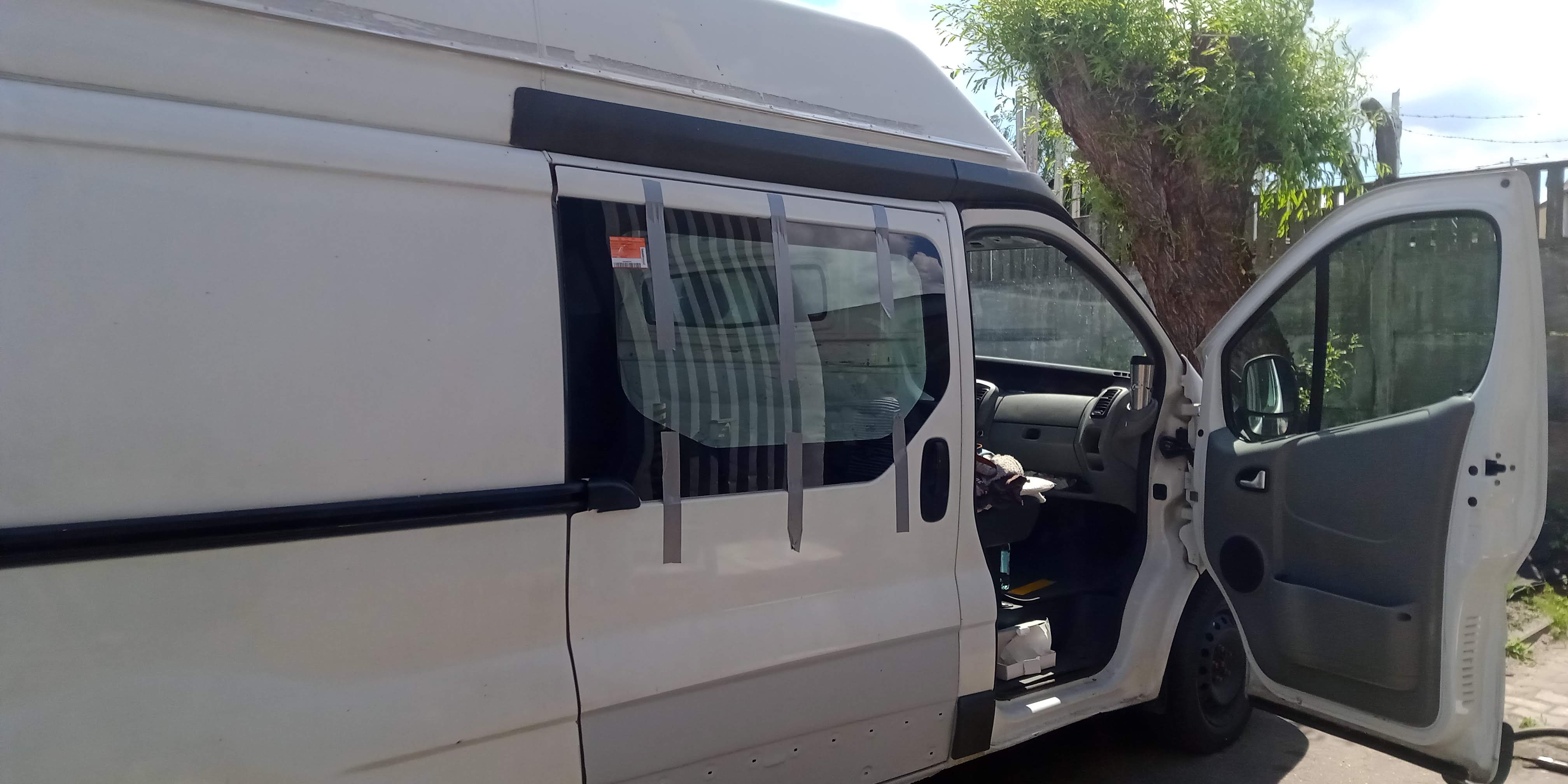 Dzisiaj, korzystając z pogody postanowiliśmy zamontować okno w drzwiach przesuwnych. Okno kupione na jesieni, można powiedzieć, że nabrało już mocy urzędowej, więc nadszedł na nie czas. Ponieważ nigdy tego wcześniej jeszcze nie robiłem to muszę się przyznać, że miałem przed tą robotą pełne portki. Naoglądałem się sporo filmów na temat wklejania takich szyb, więc jako tako, wiedziałem co trzeba robić. Kupiłem zestaw do montażu szyb samochodowych i teoretycznie byłem przygotowany, ale miałem dwie obawy. Po pierwsze, czy wystarczy primera do posmarowania blachy i szyby, bo ta miniaturowa buteleczka nie wzbudzała mojego zaufania. Po drugie, czy wystarczy kleju. Dokupiłem więc drugą buteleczkę tego gruntu i kartusz kleju do szyb. Okazało się, że moje obawy były bezpodstawne. Mikrobutelka wystarcza na naprawdę dużą powierzchnię i dało się zagruntować i szybę i karoserię. Kleju w jednym kartuszu jest aż nadto do wklejenia takiej szyby. Po kolei wyglądało to tak: