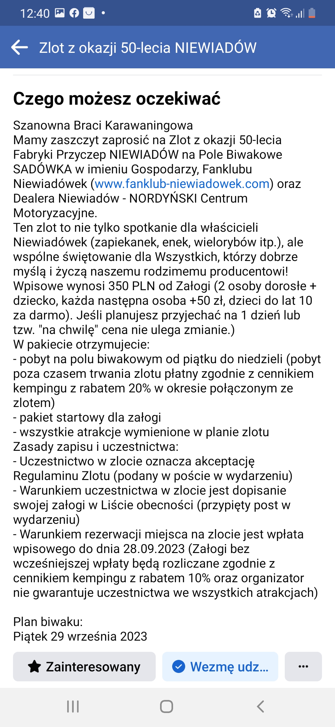 W imieniu Michała Nalepy reprezentującego "Pole Biwakowe Sadówka" i dealera Niewiadowa, "Nordyński Łódź" zapraszamy na zlot z okazji 50-cio lecia produkcji przyczep kempingowych Niewiadów: