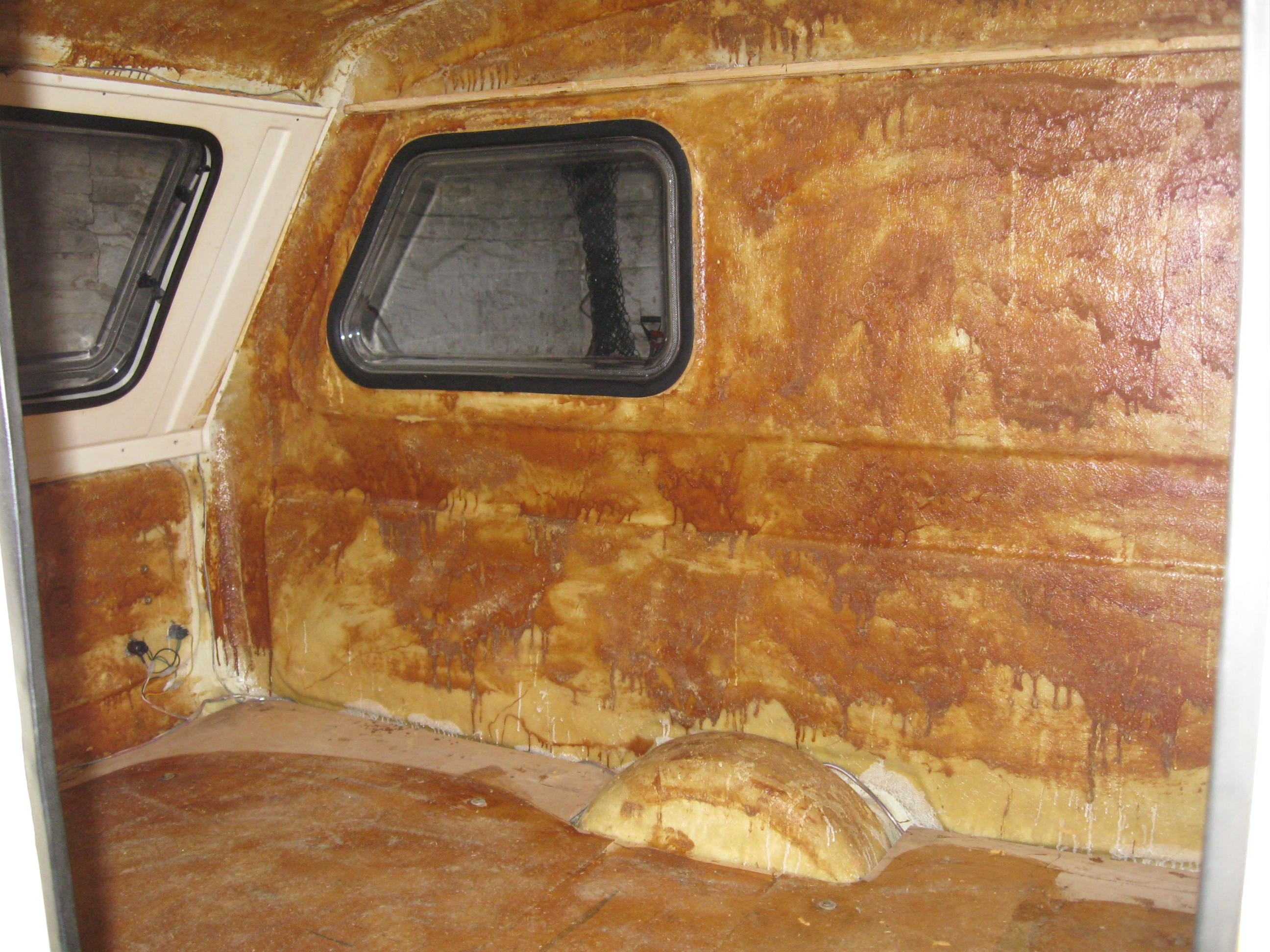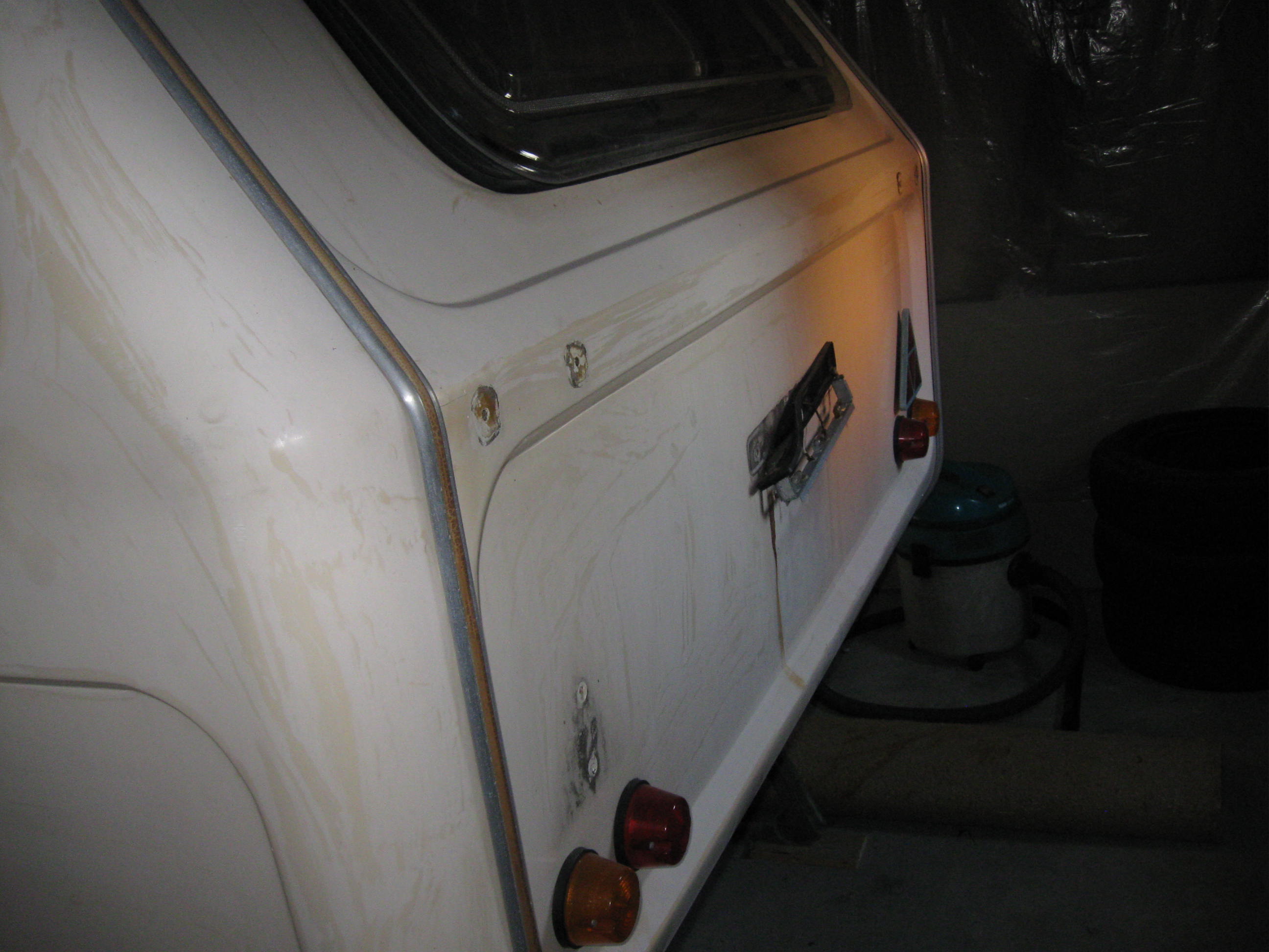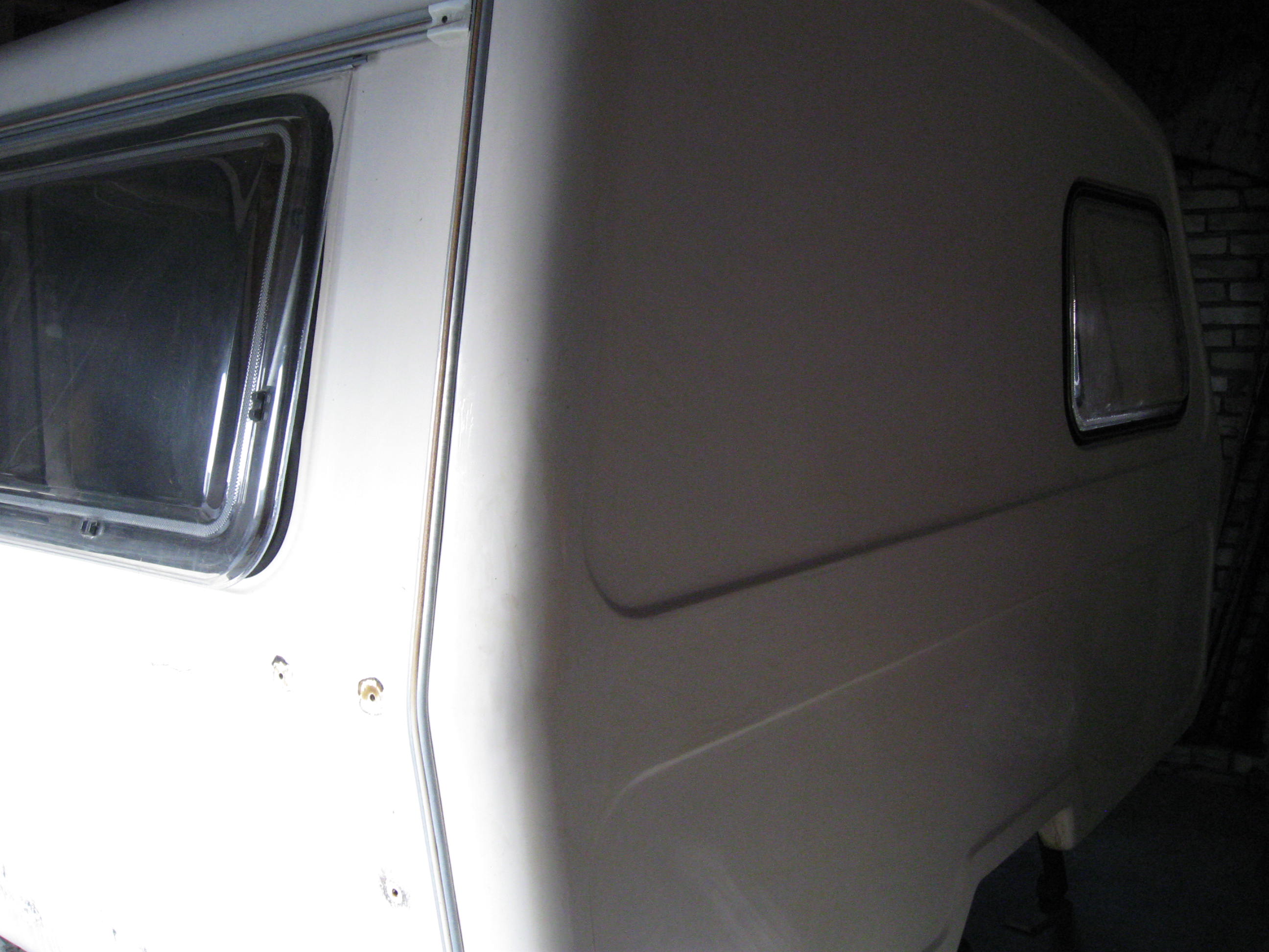 Następnie zabrałem się za dolną krawędź nadwozia,tj miejsce w którym podłoga łączy się ze skorupą.Przy pomocy szlifierki i tarczy lamelowej usunąłem łuszczące się elementy masy uszczelniającej oraz wygładziłem powierzchnię.Na miejsca w których były ubytki nałożyłem matę szklaną z żywicą.Żywicą wzmocniłem także cały "szew" dookoła przyczepy,wewnętrzne powierzchnie nadkoli oraz miejsca w których były "odpryski" laminatu.