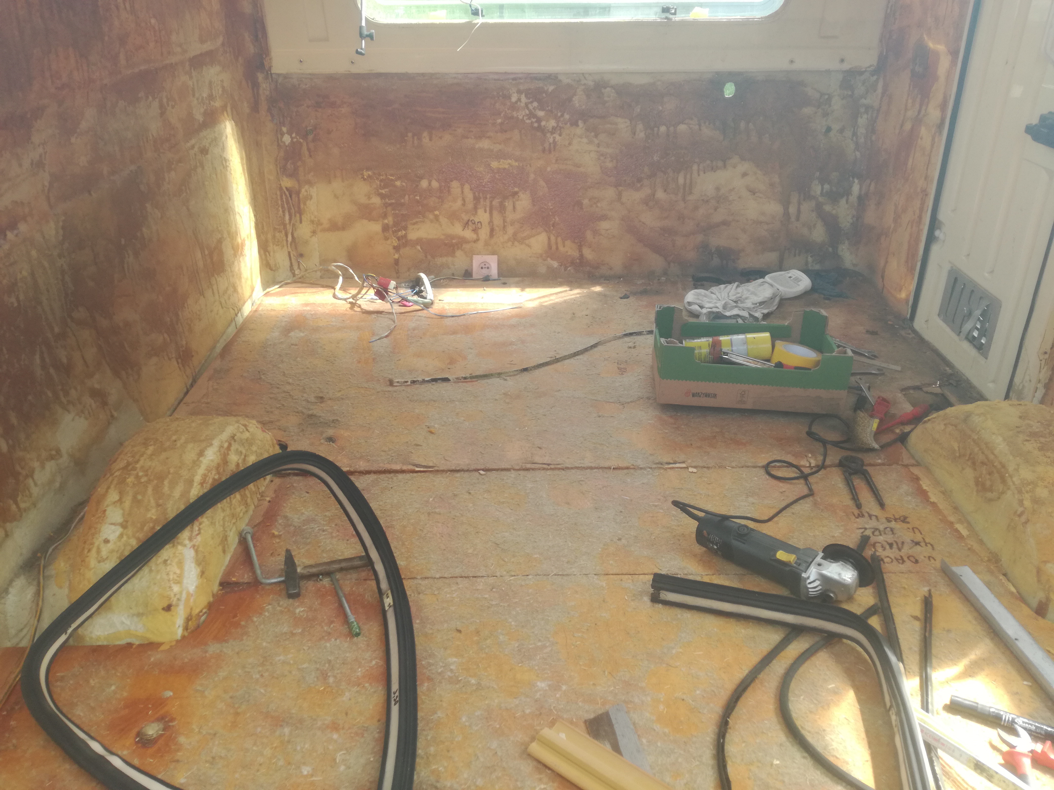 Na pierwszy ogień poszło wnętrze. Zostalo wymontowane wszystko do golej skorupy. Tapicerka nie stawiała oporów no może poza klejącą sie do wszystkiego gąbką. Sklejka na podłodze byla uszkodzona przy wejsciu i pod zlewem. Potem przyszedl czas na rozdzielenie skorupy od ramy tu już bez szlifierki kątowej sie nie obylo. Potej czynności do reki mlotek i sluchowe badanie ramy. Dzwieki tzw. zdrowe ale dalem do piaskowania gdyż bylo na niej kilka warstw chyba konserwacji do podwozia samochodowego.