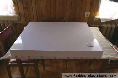 Pierwotnie materiałem na podłogę w łazience miał być poliwęglan mleczny (opal) 3 mm. Niestety, nie wziąłem drobnej kwestii pod uwagę pisząc z firmami tym się zajmującymi. Błędnie założyłem, że jak mają w ofercie docinanie poliwęglanu przezroczystego to podobnie będzie z mlecznym. Niestety, gdy przyszło do zamówienia to zweryfikowałem swoją pomyłkę. Okazało się, że poliwęglan mleczny firmy sprzedają tylko w całych płytach czasem ewentualnie pół arkusza ale to i tak kosztowało za dużo. Chcąc nie chcąc zdecydowałem się na poliwęglan przezroczysty. Pozostało pokleić formatki, a następnie całość okleić białą folią. Z klejeniem były trudne początki. Teraz już wiem że najpierw trzeba powierzchnię i folię namoczyć wodą z płynem do mycia naczyń i dopiero przykładać folię do powierzchni.