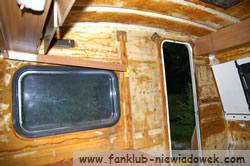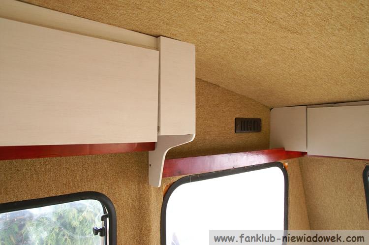 Na zimę wyjąłem wszystko z przyczepki. Szykowałem gruntowny remont mebli. Miałem zamiar zostawić szafki wiszące i łóżka, a resztę budować od początku aranżując wnętrze po swojemu. Laminat a'la wczesny Gierek zupełnie mi nie pasował i miałem w planie zrobić coś innego. Ale…zostałem zaskoczony wieloma rzeczami. Wiadomo że płyt wiórowych nie mogłem użyć - waga! - ale byłem przekonany że meble i fronty są ze sklejki więc wystarczy laminat zedrzeć, przeszlifować i będą ładne mebelki z frontami drewnianymi. I cóż plan upadł bo wszystkie fronty są z laminatu tylko z ramką drewnianą wokół. Skomplikowało to trochę sprawę. Pomyślałem, że będzie trzeba zbudować wszystkie szafki na nowo ale biorąc pod uwagę wszystkie zaoblenia, skosy aż tak bardzo w swoje zdolności manualne nie wierzyłem. Postanowiłem, że proste elementy które się da "odwrócić" - "odwrócę" laminatem do środka a surową sklejką na zewnątrz, a szkielety szafek wiszących zostawię, zedrę tylko laminat z frontowej belki. Były 3. Na każdą belkę frezarka potrzebowała 15 min, a po drugiej belce pół godziny odpoczynku, bo się przegrzała - twardy ten laminat. Tak więc od października zacząłem rozbieranie szafek wiszących, łóżek i karniszy na elementy pierwsze. Piwnica, garaż i mieszkanie stały się przechowalnią elementów. Żeby odwrócić poszczególne elementy trzeba było pozbyć się łączących je wkrętów, zszywek (zazwyczaj się urywały) i najgorsze - łączącego je kleju. Trzeba przyznać solidna robota. Najczęściej odrywała się pierwsza warstwa sklejki razem z klejem. Więc po rozebraniu było, szpachlowanie, szlifowanie szlifierką taśmową, oscylacyjną, podkolorowanie szpachli farbkami plakatowymi by bardziej drewno przypominała i sklejanie podzespołów do pierwotnej formy. Potem lakierowanie lakierobejcą.