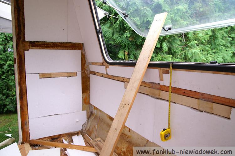 Miejsca tego wymagające wzmocniłem od środka matą szklaną z żywicą poliestrową. Dodatkowo wkleiłem kilka listew drewnianych tam gdzie planowałem montaż mebli. Od zewnątrz uszkodzony laminat przyczepy reperowałem żelkotem. W wyżłobienia drzwi wejściowych wkleiłem 3 kawałki drewna by móc w późniejszym czasie przykręcić do nich uchwyty - wieszaki.