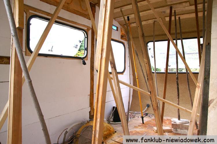 Przyszła pora na instalacje. Wymieniłem wąż doprowadzający wodę do kranu i odpływowy. Kupiłem 2 baniaki 10 litrowe jeden do środka na wodę czystą, drugi jako zewnętrzny na szarą. Do zasilania pompki użyłem zasilacza od komputera. Do instalacji 220 V w środku użyłem przewodów 3 x 1,5 mm/kw ułożonych w peszlach. Gąbki z łóżek, jako że były w dobrym stanie, zostały wyprane. Schły 3 tygodnie. Na podłogę zaplanowałem panele. Kupiłem resztkę serii po dobrej cenie. Jako podkład użyłem gąbki pod panele 2 mm. Montaż zajął jeden dzień. W międzyczasie mój ojciec, wraz z pomocą sąsiada, zajął się wykonaniem kosza zewnętrznego na koło zapasowe (na wzór pokazałem kilka pomysłów z forum).