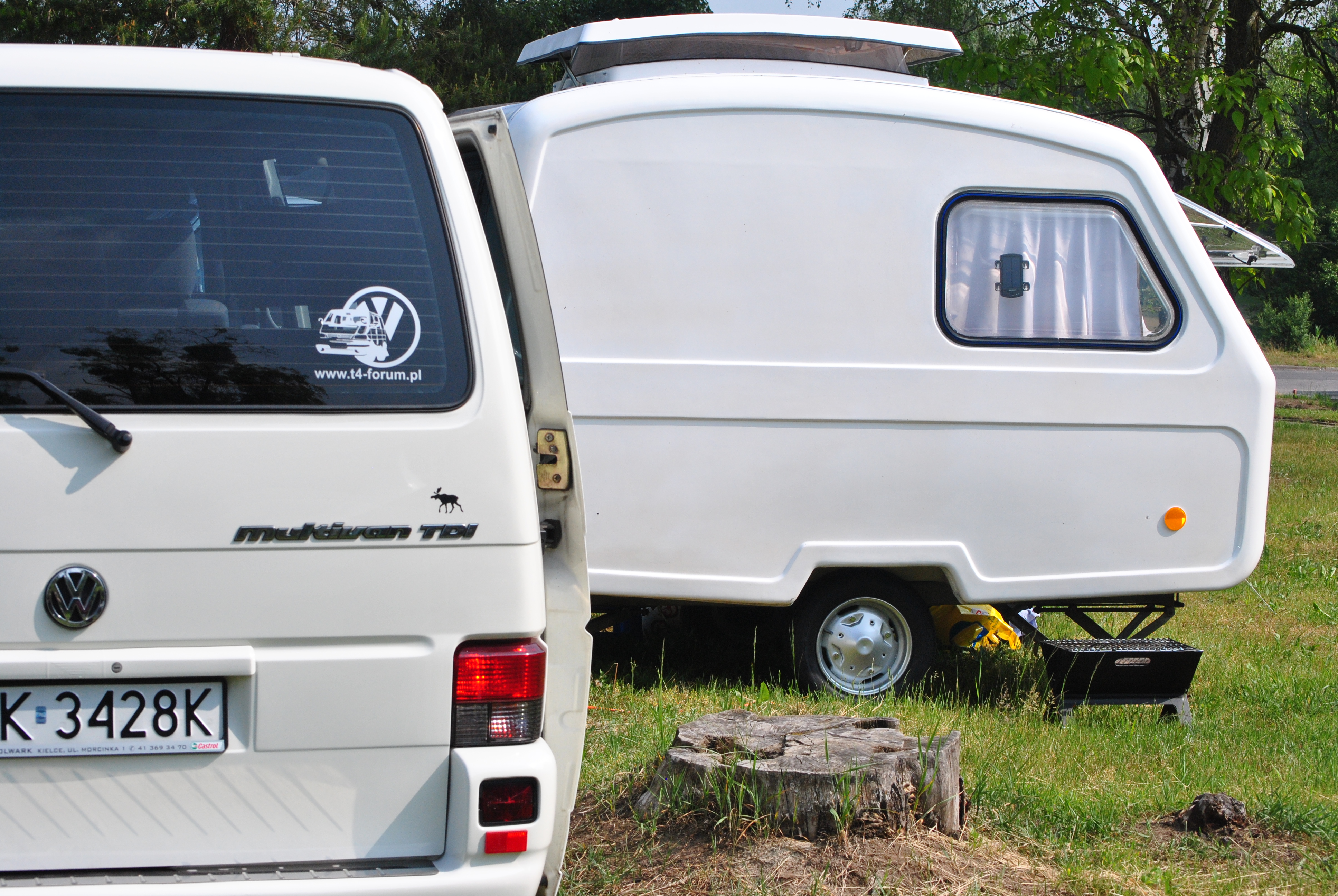 Zlot T4 w Julinku koło Warszawy. Było więcej niż super. Debiut z przyczepką - bardzo udany - mega towarzystwo i co najważniejsze pogoda dopisała. Przy okazji debiutu rozwiałem kilka dręczących mnie obaw. Bałem się, że w trasie cała ta "moja praca" się rozpadnie, nic takiego się nie stało. Myślałem że gabaryt Niewiadówki będzie za mały dla naszej trójki a okazało się, że komfort spania i codziennego użytkowania jest więcej niż wystarczający. Podsumowując, narobiłem sobie przez te 4 dni tylko smaka na dłuższe kempingowanie z Niewiadówką. Mam nadzieję, że nie trzeba będzie długo czekać do następnego wypadu. Pozdrawiamy